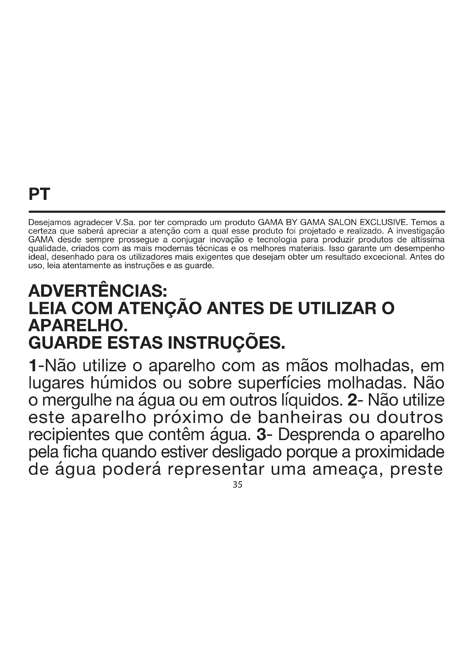 El cortapelos PRO 8 ofrece la posibilidad de realizar acabados de 0,8 mm a 3 mm. (si es utilizado sin peine 32RU Благодарим Вас за приобретение продукта GAMA BY GAMA SALON EXCLUSIVE! Мы уверены, что Вы оцените заботу, с которой он создан. GAMA комбинирует инновации и технологии, чтобы создавать продукты премиум-качества. Превосходное исполнение гарантирует применение совершенных методов и высококлассных материалов. Это обеспечивает наилучшие результаты для самых требовательных покупателей, которые хотят добиться идеального результата в салоне красоты и у себя дома. Пожалуйста, ознакомьтесь внимательно с инструкцией ниже перед использованием и сохраните ее в качестве справочного материала. МЕРЫ ПРЕДОСТОРОЖНОСТИ ВНИМАТЕЛЬНО ПРОЧИТАТЬ ПЕРЕД ИСПОЛЬЗОВАНИЕМ ПРИБОРА. СОХРАНИТЬ ДАННЫЕ ИНСТРУКЦИИ. 1 – Не брать прибор мокрыми руками, не использовать его в местах с повышенной влажностью или на мокрых поверхностях. Не погружать его в воду или в любую другую жидкость. 2 – Не использовать данный прибор рядом с ванными или другими ёмкостями, заполненными guía y valiéndose de la palanca regulable) y de efectuar el clásico corte de pelo con los siguientes largos: 3, 6, 9 y 12 mm. PALANCA REGULABLE: Sobre el lado izquierdo del cuerpo del aparato se encuentra la palanca para la regulación de la altura del corte (Fig.1), que permite regular su altura a 0,8 mm., 1 mm., 2 mm. y 3 mm. 0,8 mm. en la posición más alta, 1 mm. si se la desplaza un punto hacia el lado posterior del cuerpo del aparato, 2 mm. si se la desplaza dos puntos hacia el lado posterior del cuerpo del aparato y 3 mm. si se la desplaza tres puntos hacia el lado posterior del cuerpo del aparato. Fig.1 LIMPIEZA Y MANTENIMIENTO: Un cortapelos limpio y bien lubricado mejora notablemente su capacidad y precisión de corte. NO LIMPIAR NINGUNA PARTE DEL APARATO BAJO EL AGUA CORRIENTE. CÓMO LIMPIAR EL CABEZAL: Antes de cualquier operación de limpieza, asegurarse que el aparato esté apagado y haya sido desenchufado 33de la toma de corriente. Remover el accesorio de estar insertado. Con el cepillo de limpieza incluido, remover los eventuales residuos de pelo de entre la cuchilla y su retro cabezal. NO DESMONTAR NUNCA EL CABEZAL NI LAS PARTES QUE LO INTEGRAN PARA NO PERDER EL DERECHO A GARANTÍA DE TODO EL PRODUCTO. CÓMO Y CUÁNDO LUBRICAR LA CUCHILLA: Antes del primer uso se aconseja lubricar la cuchilla con unas gotas del aceite presente en la caja o de cualquier otro aceite lubricante (asegurarse de que no sea demasiado viscoso). Volcar el cortapelos (Fig2) para evitar que entre aceite en la máquina. Lubricar con unas gotas de aceite la cuchilla. Para que el aceite se distribuya uniformemente, encender el aparato por unos segundos. Finalmente, con un paño seco, eliminar el eventual aceite excedente. Para los usuarios profesionales, el proceso de lubricación debe realizarse diariamente. En caso de uso doméstico, puede hacerse mensualmente o con una frecuencia mensual, dependiendo del uso del producto. Fig.2 DURACIÓN DE LA CUCHILLA: La duración de la cuchilla varía según la frecuencia y el tiempo de uso. Aunque se realice un correcto mante- nimiento, si la eficiencia del corte resultara comprometida, dirigirse al fabricante para la sustitución del cabezal completo. En el sitio web www.gamaprofessional.com puedes encontrar los manuales de producto y las advertencias. 34PT Desejamos agradecer V.Sa. por ter comprado um produto GAMA BY GAMA SALON EXCLUSIVE. Temos a certeza que saberá apreciar a atenção com a qual esse produto foi projetado e realizado. A investigação GAMA desde sempre prossegue a conjugar inovação e tecnologia para produzir produtos de altíssima qualidade, criados com as mais modernas técnicas e os melhores materiais. Isso garante um desempenho ideal, desenhado para os utilizadores mais exigentes que desejam obter um resultado excecional. Antes do uso, leia atentamente as instruções e as guarde. ADVERTÊNCIAS: LEIA COM ATENÇÃO ANTES DE UTILIZAR O APARELHO. GUARDE ESTAS INSTRUÇÕES. 1-Não utilize o aparelho com as mãos molhadas, em lugares húmidos ou sobre superfícies molhadas. Não o mergulhe na água ou em outros líquidos. 2- Não utilize este aparelho próximo de banheiras ou doutros recipientes que contêm água. 3- Desprenda o aparelho pela ficha quando estiver desligado porque a proximidade de água poderá representar uma ameaça, preste 35atenção especial quando utilizar o mesmo na casa de banho. 4- Evite utilizar este aparelho elétrico se anteriormente tiver entrado em contacto com substâncias líquidas, se apresentar o cabo de alimentação danificado ou se houver danos evidentes na parte externa do corpo ou em qualquer acessório do mesmo. Se porventura o aparelho não funcionar corretamente, desligue-o logo da corrente e procure um centro de assistência técnica para executar um controlo. 5- A fim de evitar riscos, se o cabo de alimentação estiver danificado, solicite imediatamente a sua substituição junto ao fabricante, um centro de assistência técnica autorizado ou a pessoal qualificado. 6- Mantenha o aparelho e o cabo de alimentação longe de fontes de calor e de superfícies sensíveis ao calor (plástico, tecidos de 