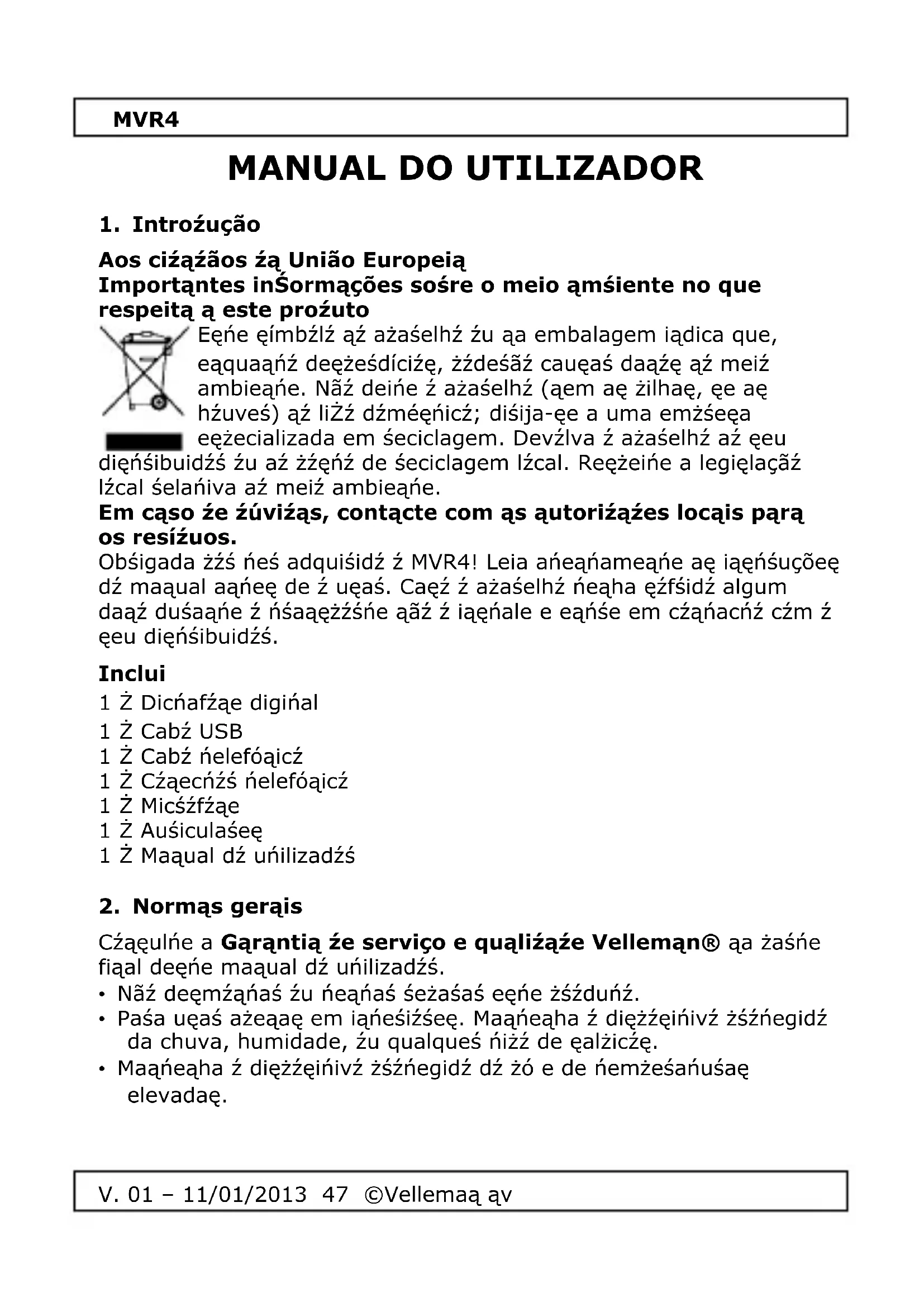 Baixe as instruções para o seu Gravador de áudio em formato PDF gratuitamente! Encontre o seu manual MVR4 - VELLEMAN e retome o controlo do seu dispositivo eletrónico. Nesta página estão publicados todos os documentos necessários para a utilização do seu dispositivo. MVR4 da marca VELLEMAN.