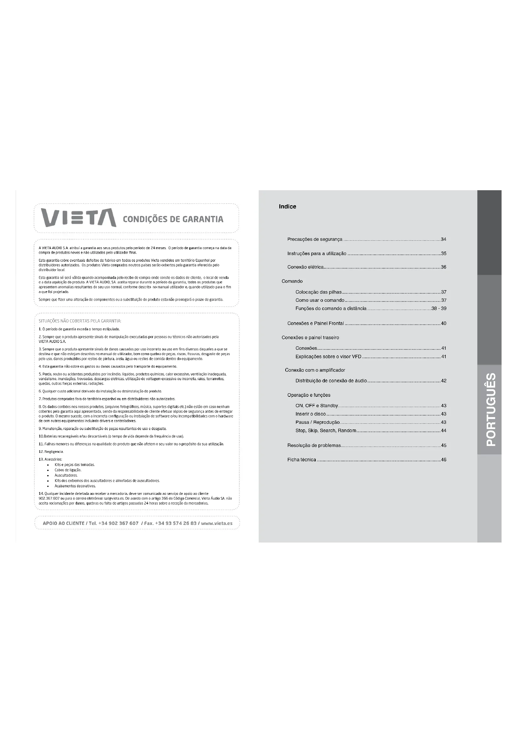 Esta guaranta s sera valida quando a companhada可以使 o农业科技 e os datos de cliente, o local de vendra e a data aquisao de produto. A VIETA AUDIO, SA, aceira reparar durante o periodo de garantia, todos os produits que aparecem anomalias resultantes do seu uso normal, conforme descriço no manual utilizador e, quando usado para cimar a que foi projetado.