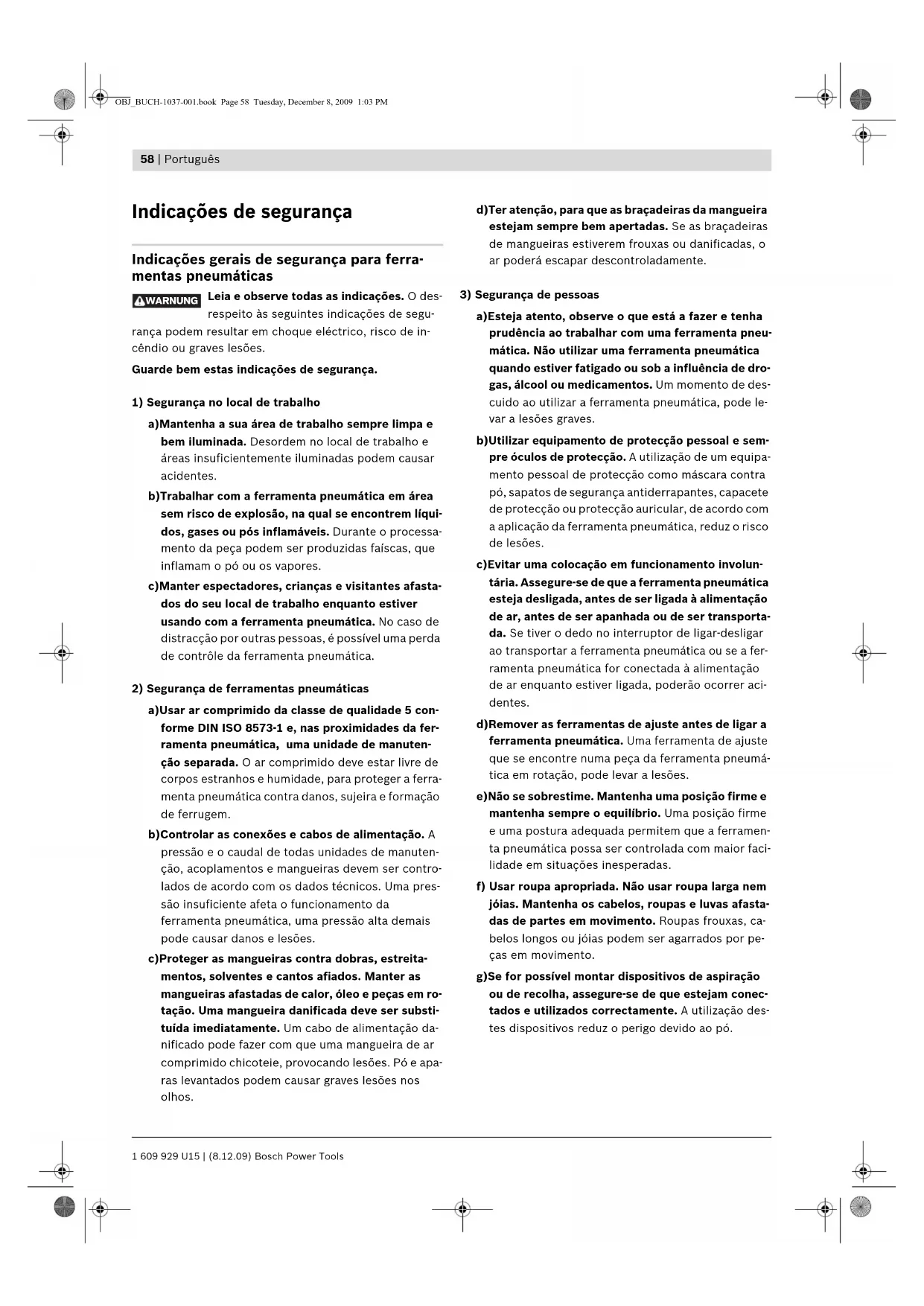 a)Esteja atento, observe o que está a fazer e tenha prudência ao trabalhar com uma ferramenta pneu- mática. Não utilizar uma ferramenta pneumática quando estiver fatigado ou sob a influência de dro- gas, álcool ou medicamentos. Um momento de des- cuido ao utilizar a ferramenta pneumática, pode le- var a lesões graves. b)Utilizar equipamento de protecção pessoal e sem- pre óculos de protecção. A utilização de um equipa- mento pessoal de protecção como máscara contra pó, sapatos de segurança antiderrapantes, capacete de protecção ou protecção auricular, de acordo com a aplicação da ferramenta pneumática, reduz o risco de lesões. c)Evitar uma colocação em funcionamento involun- tária. Assegure-se de que a ferramenta pneumática esteja desligada, antes de ser ligada à alimentação de ar, antes de ser apanhada ou de ser transporta- da. Se tiver o dedo no interruptor de ligar-desligar ao transportar a ferramenta pneumática ou se a fer- ramenta pneumática for conectada à alimentação de ar enquanto estiver ligada, poderão ocorrer aci- dentes. d)Remover as ferramentas de ajuste antes de ligar a ferramenta pneumática. Uma ferramenta de ajuste que se encontre numa peça da ferramenta pneumá- tica em rotação, pode levar a lesões. e)Não se sobrestime. Mantenha uma posição firme e mantenha sempre o equilíbrio. Uma posição firme e uma postura adequada permitem que a ferramen- ta pneumática possa ser controlada com maior faci- lidade em situações inesperadas. f) Usar roupa apropriada. Não usar roupa larga nem jóias. Mantenha os cabelos, roupas e luvas afasta- das de partes em movimento. Roupas frouxas, ca- belos longos ou jóias podem ser agarrados por pe- ças em movimento. g)Se for possível montar dispositivos de aspiração ou de recolha, assegure-se de que estejam conec- tados e utilizados correctamente. A utilização des- tes dispositivos reduz o perigo devido ao pó. WARNUNG OBJ_BUCH-1037-001.book Page 58 Tuesday, December 8, 2009 1:03 PMPortuguês | 59 Bosch Power Tools 1 609 929 U15 | (8.12.09) h)Não respirar diretamente o ar de escape. Evitar que o ar de escape entre em contacto com os olhos. O ar de escape da ferramenta pneumática po- de conter água, óleo, partículas metálicas e sujida- des do compressor. Isto pode causar problemas de saúde.
