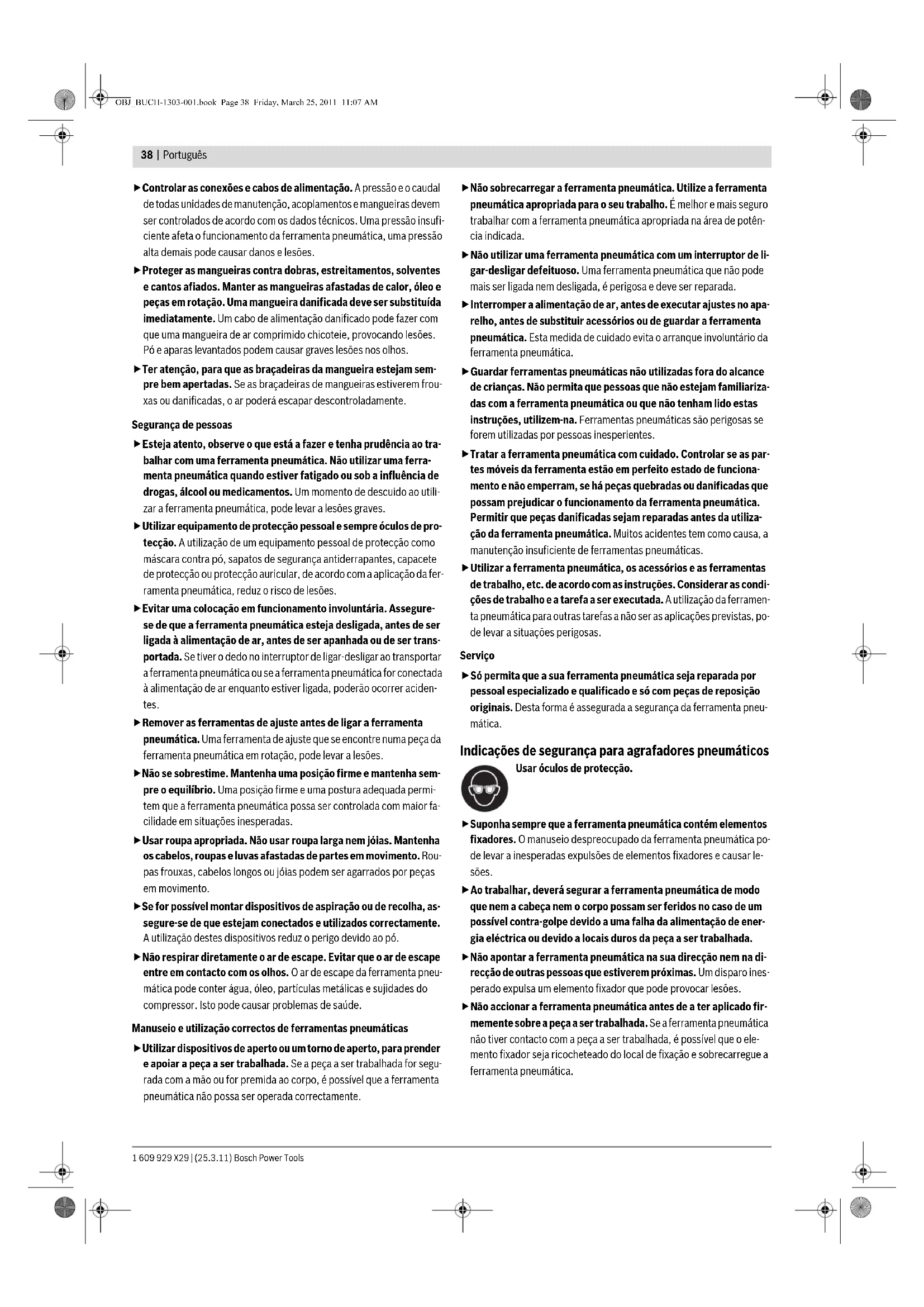 Peso conforme EPTA-Procedure 01/2003 kg 2,5 Dr. Egbert Schneider Senior Vice President Engineering Dr. Eckerhard Strötgen Head of Product Certification Agrafador pneumático GCN 45-15 Professional Símbolo Causador Sistema de disparo Gatilho 5 (cinza) Disparo individual com se- quência de segurança Gatilho 8 (vermelho) Disparo de contacto OBJ_BUCH-1303-001.book Page 40 Friday, March 25, 2011 11:07 AMPortuguês | 41 Bosch Power Tools 1 609 929 X29 | (25.3.11) Carregar o carregador (veja figuras C1–C3) Interromper a alimentação de ar, antes de executar ajustes no aparelho, antes de substituir acessórios ou de guardar a ferramenta pneumática. Esta medida de cuidado evita o arranque involuntário da ferramenta pneu- mática. fSó utilizar acessórios originais Bosch (veja “Dados técnicos”). As peças de precisão da ferramenta pneumática, como carregador, bocal e canal de tiro são adaptados para agrafos, pregos e cavilhas da Bosch. Outros fabricantes utilizam uma outra qualidade de aço e outras dimen- sões. A utilização de elementos fixadores inadmissíveis pode danificar a fer- ramenta pneumática e causar lesões. Ao encher o carregador deverá segurar a ferramenta pneumática de mo- do que o bocal 9 não aponte na direcção do seu corpo nem na direcção de outras pessoas. – Limpar e lubrificar o canal de disparo 21 sempre que for necessário e assegure-se de que o carregador 6 não esteja sujo. – Premir sobre o fecho do carregador 4 e abrir a tampa do carregador 7. O veio do carregador 19 deve ser ajustado de acordo com o comprimento dos pregos, para que os pregos possam rolar para frente, em direcção do bocal, sem qualquer atrito. – Puxar o veio do carregador 19 para cima e girar o veio do carregador, até engatar na posição desejada. – Aplicar o rolo de pregos 20 sobre o veio do carregador 19. – Desenrolar suficientes pregos, de modo que o primeiro prego no canal de disparo 21 e o segundo prego possa ser posicionado no gancho de alimentação 22. Colocar as cabeças dos pregos na ranhura de guia 23. – Fechar a tampa do carregador 7 até o fecho do carregador 4 engatar. fObserve que ao colocar o rolo de pregos, o enrolamento de arame dos pregos não seja danificado nem deformado. Devido a um enro- lamento de arame danificado, ou um rolo de pregos colocado de forma errada, é possível que a tampa do carregador não possa mais ser cor- rectamente fechada. Isto leva a um erro de funcionamento da ferra- menta pneumática. Serviço Sistemas de disparo A ferramenta pneumática pode ser operada com dois sistemas de disparo distintos: – Disparo individual com sequência de segurança Neste sistema de disparo é necessário que a protecção contra disparo 10 seja primeiramente premida firmemente sobre a peça a ser traba- lhada. Um elemento fixador só é atirado quando o gatilho é premido. Em seguida só podem ser realizados outros processos de agrafar, se antes o gatilho e a protecção contra disparo for recolocado na sua po- sição inicial. – Disparo de contacto Neste sistema de disparo é primeiro necessário premir o gatilho . Um elemento fixador só é atirado se a protecção contra disparo 10 for co- locada firmemente sobre a peça a ser trabalhada, com o gatilho premi- do. Assim é alcançada uma velocidade de trabalho mais alta. O sistema de disparo é selecionado através da montagem do respectivo gatilho. (veja “Trocar o gatilho”, página 40) Colocação em serviço Interromper a alimentação de ar, antes de executar ajustes no aparelho, antes de substituir acessórios ou de guardar a ferramenta pneumática. Esta medida de cuidado evita o arranque involuntário da ferramenta pneu- mática. Trabalhar com o disparo individual (veja figura D) – Montar o gatilho cinza 5. (veja “Trocar o gatilho”, página 40) – Apoiar o bocal 9 firmemente sobre a peça a ser trabalhada, até a pro- tecção contra disparo 10 estar completamente comprimida. – Premir em seguida por instantes o gatilho 5 e soltá-lo novamente. É atirado um prego. – Permitir que a ferramenta pneumática ressalte da peça a ser trabalha- da. – Para um outro processo de agrafar é necessário levantar a ferramenta pneumática completamente da peça a ser trabalhada e colocá-la firme- mente sobre a próxima posição desejada. Trabalhar com o disparo de contacto (veja figura E) – Montar o gatilho vermelho 8. (veja “Trocar o gatilho”, página 40) – Premir o gatilho 8 e mantê-lo premido. – Apoiar o bocal 9 firmemente sobre a peça a ser trabalhada, até a pro- tecção contra disparo 10 estar completamente comprimida. É atirado um prego. – Permitir que a ferramenta pneumática ressalte da peça a ser trabalha- da. – Para um outro processo de agrafar é necessário levantar a ferramenta pneumática completamente da peça a ser trabalhada e colocá-la firme- mente sobre a próxima posição desejada. – Movimentar a ferramenta pneumática uniformemente, elevando-a e re- colocando-a sobre a peça a ser trabalhada. Cada vez que a ferramenta pneumática for colocada, e a protecção contra disparo estiver premida para dentro, é atirado um prego. – Assim que tiver encravado o número desejado de pregos, deverá soltar novamente o gatilho 8. Indicações de trabalho Interromper a alimentação de ar, antes de executar ajustes no aparelho, antes de substituir acessórios ou de guardar a ferramenta pneumática. Esta medida de cuidado evita o arranque involuntário da ferramenta pneu- mática. Antes do início de cada processo de trabalho deverá controlar o funciona- mento perfeito dos dispositivos de segurança e de disparo, assim como a posição firme de todos os parafusos e porcas. Uma ferramenta pneumática defeituosa, ou que não trabalhe perfeita- mente, deve ser separada imediatamente da alimentação de ar e entrar em contacto com uma oficina de serviço pós-venda autorizada Bosch. Comprimento dos pregos 19 mm–32 mm 32 mm–44 mm Descrição 