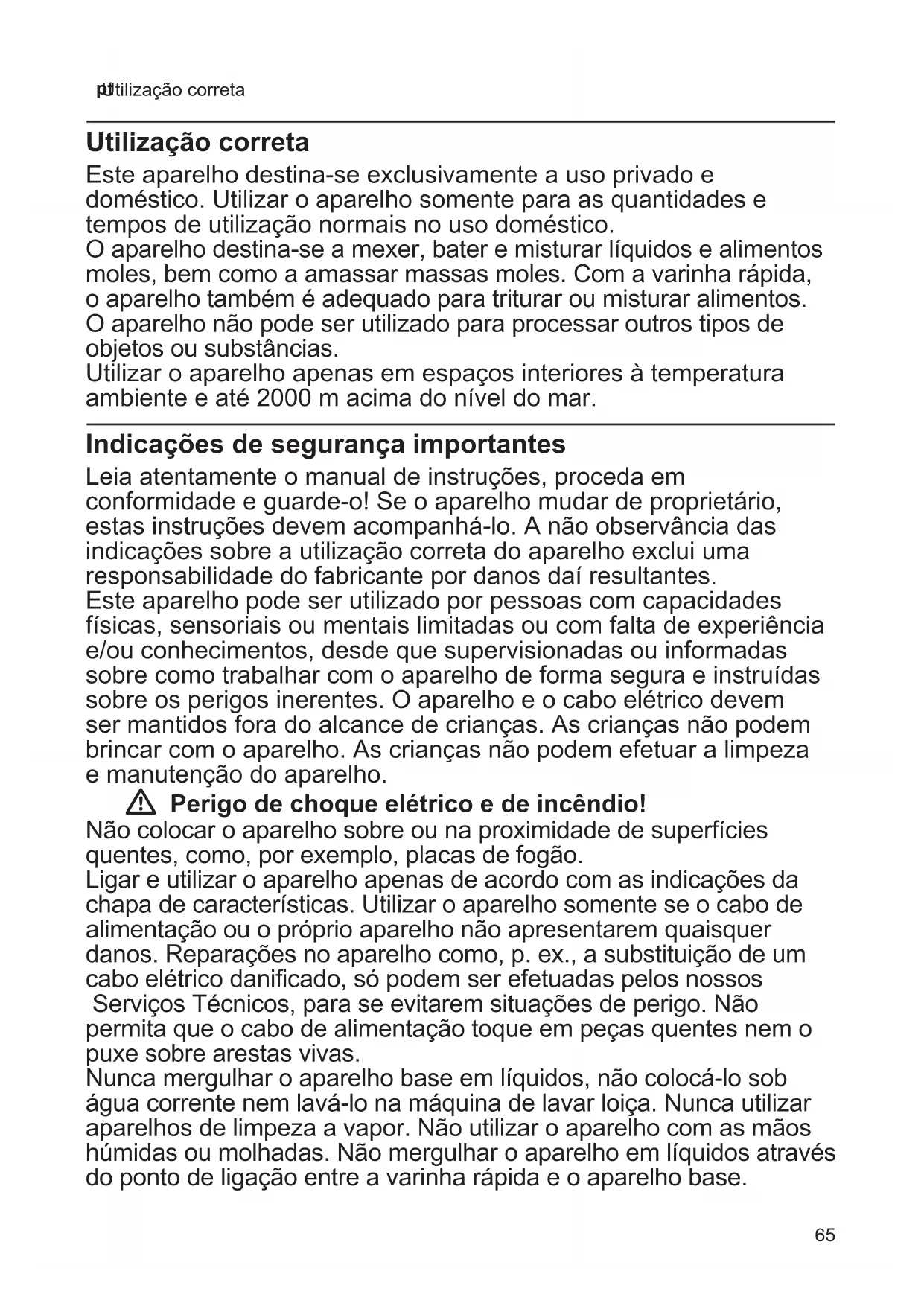 Utilização correta Utilização correta Este aparelho destinase exclusivamente a uso privado e doméstico. Utilizar o aparelho somente para as quantidades e tempos de utilização normais no uso doméstico. O aparelho destinase a mexer, bater e misturar líquidos e alimentos moles, bem como a amassar massas moles. Com a varinha rápida, o aparelho também é adequado para triturar ou misturar alimentos. O aparelho não pode ser utilizado para processar outros tipos de objetos ou substâncias. Utilizar o aparelho apenas em espaços interiores à temperatura ambiente e até 2000 m acima do nível do mar. Indicações de segurança importantes Leia atentamente o manual de instruções, proceda em conformidade e guardeo! Se o aparelho mudar de proprietário, estas instruções devem acompanhálo. A não observância das indicações sobre a utilização correta do aparelho exclui uma responsabilidade do fabricante por danos daí resultantes. Este aparelho pode ser utilizado por pessoas com capacidades físicas, sensoriais ou mentais limitadas ou com falta de experiência e/ou conhecimentos, desde que supervisionadas ou informadas sobre como trabalhar com o aparelho de forma segura e instruídas sobre os perigos inerentes. O aparelho e o cabo elétrico devem ser mantidos fora do alcance de crianças. As crianças não podem brincar com o aparelho. As crianças não podem efetuar a limpeza e manutenção do aparelho. W Perigo de choque elétrico e de incêndio! Não colocar o aparelho sobre ou na proximidade de superfícies quentes, como, por exemplo, placas de fogão. Ligar e utilizar o aparelho apenas de acordo com as indicações da chapa de características. Utilizar o aparelho somente se o cabo de alimentação ou o próprio aparelho não apresentarem quaisquer danos. Reparações no aparelho como, p. ex., a substituição de um cabo elétrico danificado, só podem ser efetuadas pelos nossos Serviços Técnicos, para se evitarem situações de perigo. Não permita que o cabo de alimentação toque em peças quentes nem o puxe sobre arestas vivas. Nunca mergulhar o aparelho base em líquidos, não colocálo sob água corrente nem laválo na máquina de lavar loiça. Nunca utilizar aparelhos de limpeza a vapor. Não utilizar o aparelho com as mãos húmidas ou molhadas. Não mergulhar o aparelho em líquidos através do ponto de ligação entre a varinha rápida e o aparelho base.66 pt Indicações de segurança importantes Desligue o aparelho da corrente após cada utilização, sempre que fique sem vigilância, antes de se montar, desmontar ou limpar, e em caso de anomalia. W Perigo de ferimentos! Nunca ligar o aparelho a relógios temporizadores ou a tomadas telecomandadas. No caso de uma falha de corrente, o aparelho continua ligado e volta a funcionar, logo que volte a corrente. Desligar imediatamente o aparelho. Vigiar sempre o aparelho durante o funcionamento! Nunca deixar o aparelho ligado durante mais tempo do que o necessário para a preparação dos alimentos. Imediatamente após utilizar o aparelho, aguardar até que o acionamento esteja completamente imobilizado. Antes da troca de acessórios ou de peças adicionais que sejam deslocadas durante o funcionamento, é necessário desligar o aparelho e separálo da rede elétrica. Só colocar ou retirar as ferramentas depois de o aparelho estar parado – depois de desligado, o aparelho ainda funciona por breves instantes. Não utilizar o aparelho em vazio. Nunca tocar nas peças em rotação. Nunca tocar na lâmina do pé misturador. Nunca limpar as lâminas com as mãos sem qualquer proteção. Utilizar uma escova. Proteger cabelos compridos ou peças de roupa soltas para não ficarem presos nas ferramentas em rotação. Este aparelho só pode ser utilizado com peças e acessórios originais. Nunca utilizar os acessórios para outros aparelhos. Colocar apenas pares de ferramentas do mesmo tipo (p. ex., 2 varas para massas pesadas). Nunca utilizar uma ferramenta em simultâneo com um acessório inserido na abertura posterior. W Perigo de queimaduras! Cuidado ao processar alimentos quentes. Os alimentos quentes podem salpicar durante o processamento. W Importante! Para utilizar a varinha rápida dentro da panela, retirar primeiro a panela do bico do fogão. O copo misturador não é adequado para utilização no microondas. É impreterível limpar cuidadosamente o aparelho após cada utilização ou após um longo período de não utilização, conforme descrito. X “Depois da utilização / Limpeza” ver página 6867