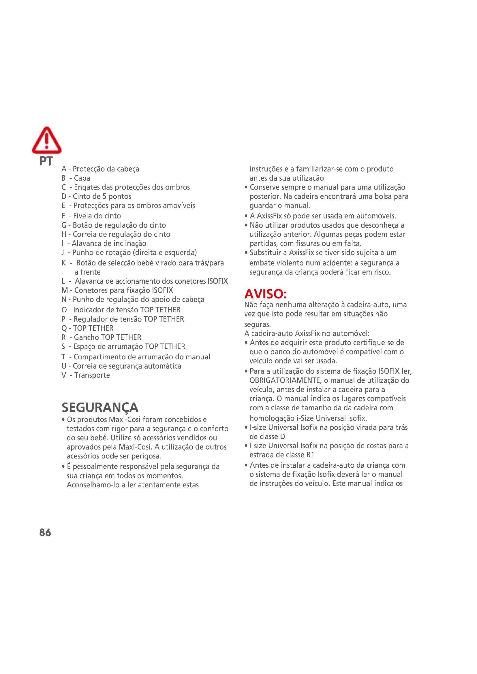 R - Gancho TOP TETHER S - Espaço de arrumação TOP TETHER T - Compartimento de arrumação do manual U - Correia de segurança automática V - Transporte SEGURANÇA