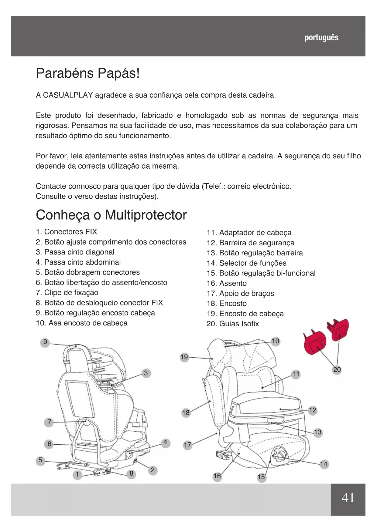 Parabéns Papás! A CASUALPLAY agradece a sua conança pela compra desta cadeira. Este produto foi desenhado, fabricado e homologado sob as normas de segurança mais rigorosas. Pensamos na sua facilidade de uso, mas necessitamos da sua colaboração para um resultado óptimo do seu funcionamento. Por favor, leia atentamente estas instruções antes de utilizar a cadeira. A segurança do seu lho depende da correcta utilização da mesma. Contacte connosco para qualquer tipo de dúvida (Telef.: correio electrónico. Consulte o verso destas instruções). Conheça o Multiprotector português42 IMPORTANTE Uso apropriado apenas nos veículos equipados com cinto de três pontos com retractor, aprovado pela UN/ECE -16 ou standard equivalente. AVISO