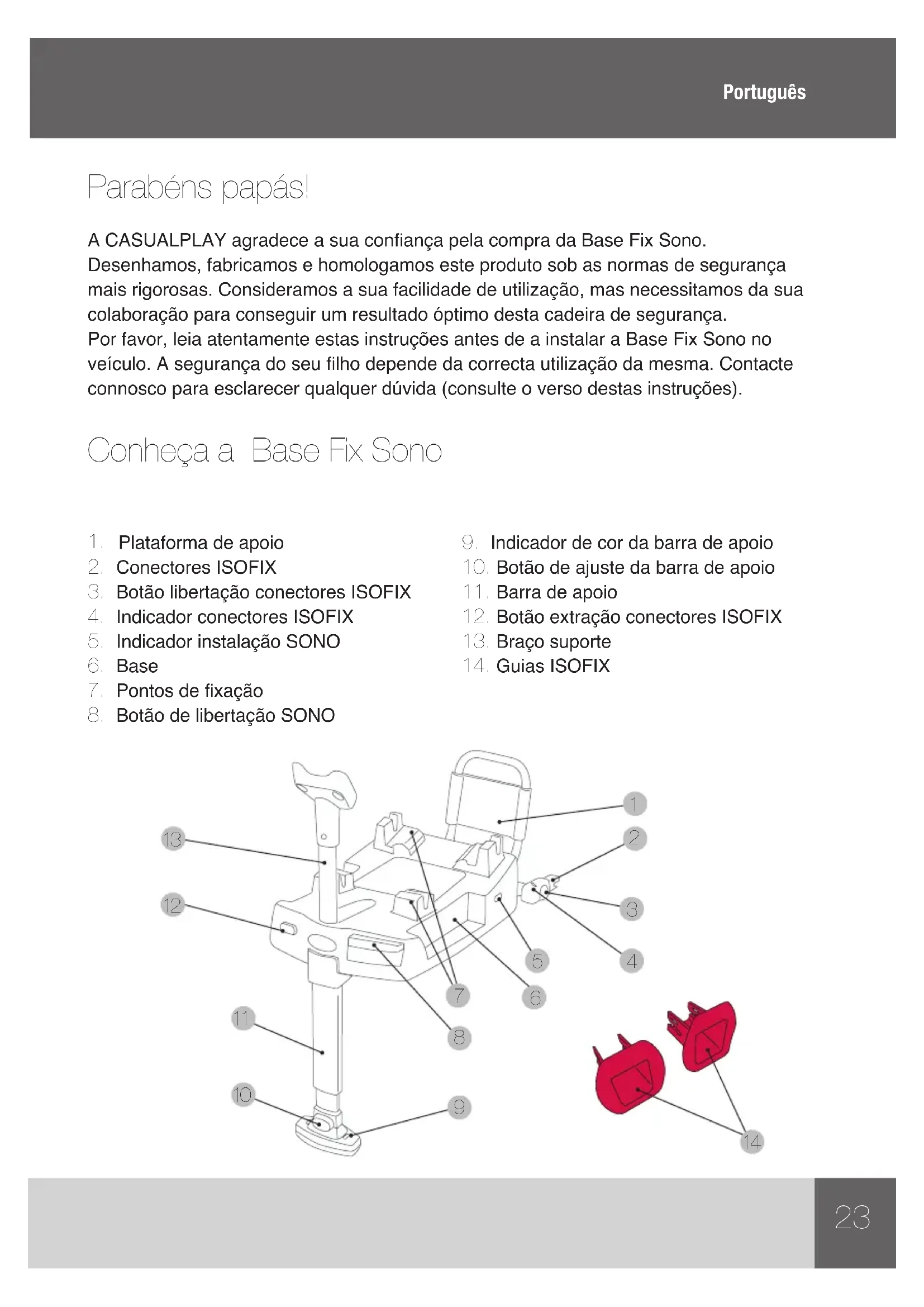 Parabéns papás! A CASUALPLAY agradece a sua conança pela compra da Base Fix Sono. Desenhamos, fabricamos e homologamos este produto sob as normas de segurança mais rigorosas. Consideramos a sua facilidade de utilização, mas necessitamos da sua colaboração para conseguir um resultado óptimo desta cadeira de segurança. Por favor, leia atentamente estas instruções antes de a instalar a Base Fix Sono no veículo. A segurança do seu lho depende da correcta utilização da mesma. Contacte connosco para esclarecer qualquer dúvida (consulte o verso destas instruções). Conheça a Base Fix Sono Português