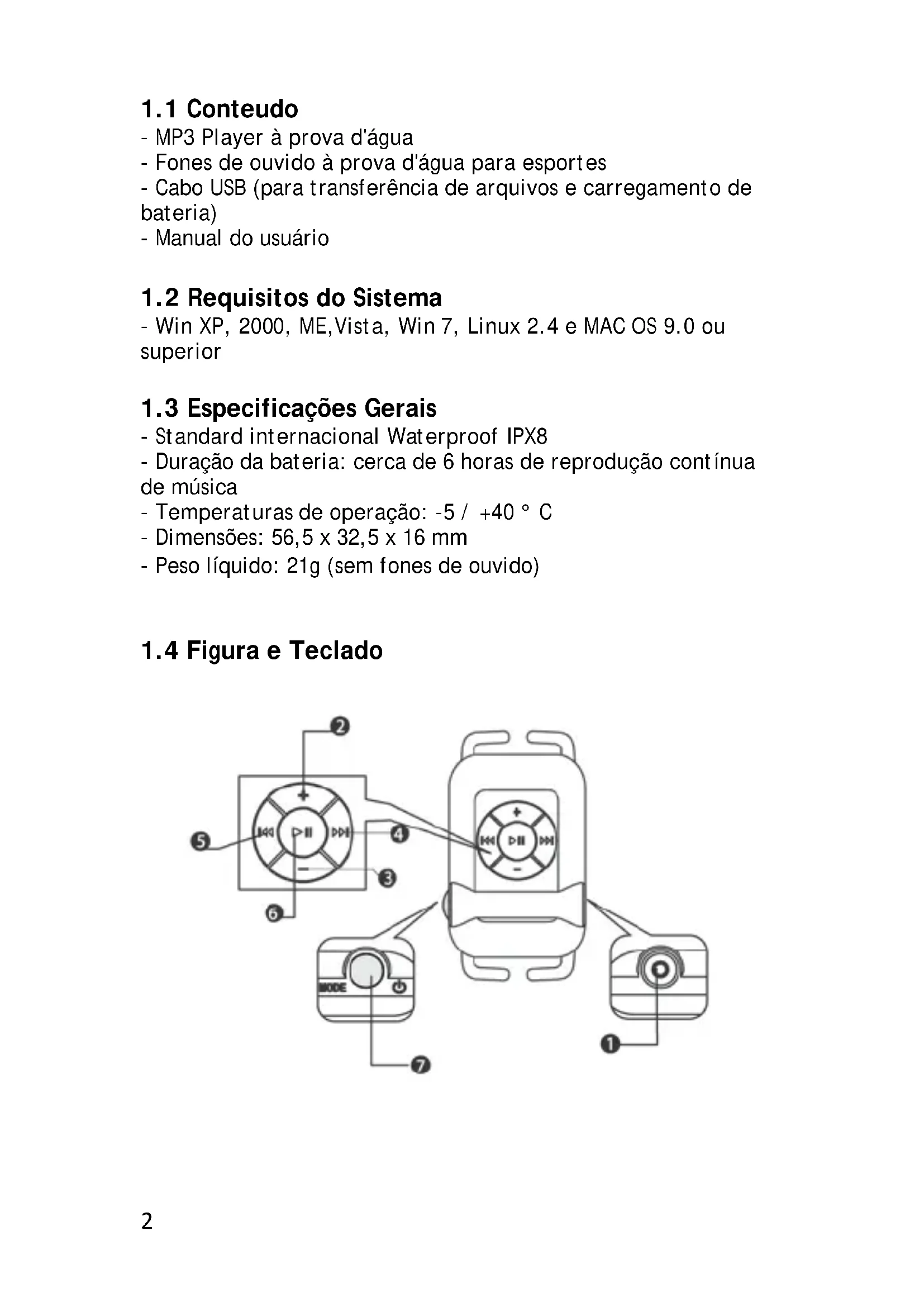 Formato Audio Mp3, WMA Bit Rate 32-320 Kbps Memoria Interna 2 GB Bateria recarregavel 6 horas de reprodução Interface USB USB 2.0 High Speed Modo de reprodução Normal, Random Sistemas Operacionais Win XP, 2000, ME, Vista Linux 2.4 e MAC 9.0 ou superior temperatura de armazenamento 10/50°C circa Faixa de temperatura -5/+40°C circa dimensões 56,5x32,5x16mm peso líquido 21g sem fones de ouvido8