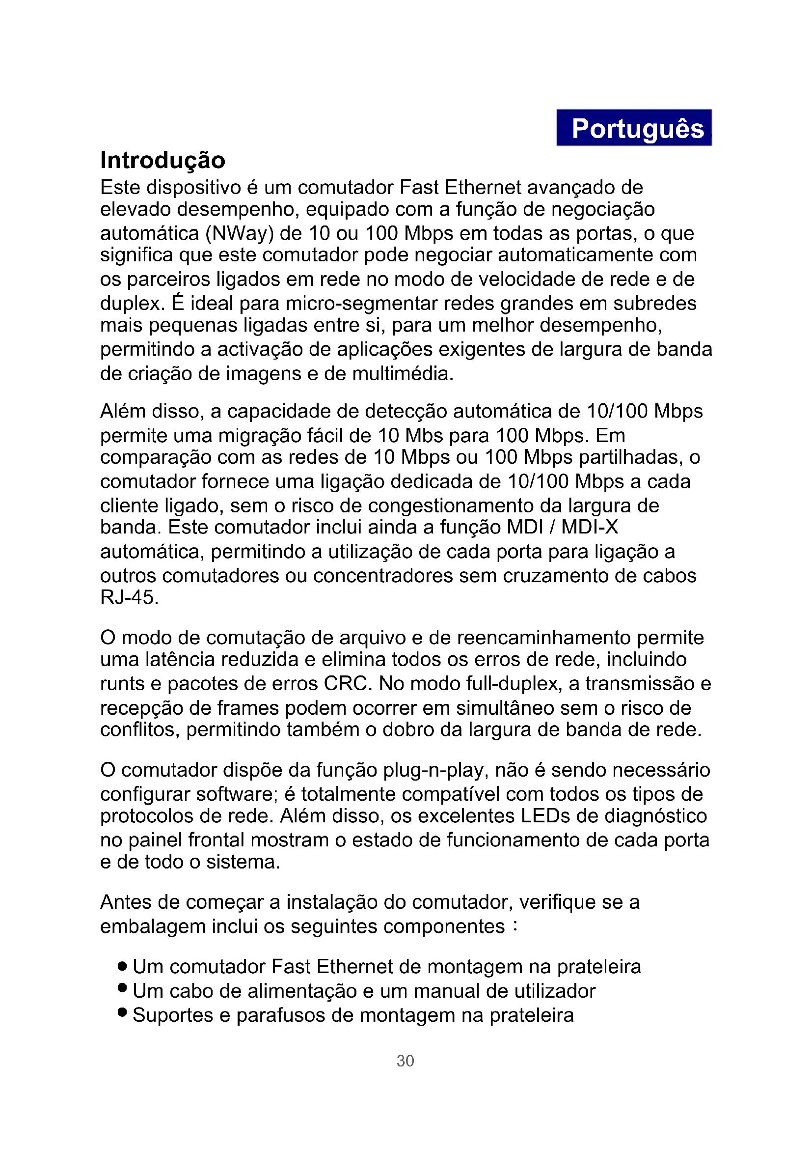 29Português. Introdução Este dispositivo é um comutador Fast Ethernet avançado de elevado desempenho, equipado com a função de negociação automática (NWay) de 10 ou 100 Mbps em todas as portas, o que significa que este comutador pode negociar automaticamente com os parceiros ligados em rede no modo de velocidade de rede e de duplex. É ideal para micro-segmentar redes grandes em subredes mais pequenas ligadas entre si, para um melhor desempenho, permitindo a activação de aplicações exigentes de largura de banda de criação de imagens e de multimédia. Além disso, a capacidade de detecção automática de 10/100 Mbps permite uma migração fácil de 10 Mbs para 100 Mbps. Em comparação com as redes de 10 Mbps ou 100 Mbps partilhadas, o comutador fornece uma ligação dedicada de 10/100 Mbps a cada cliente ligado, sem o risco de congestionamento da largura de banda. Este comutador inclui ainda a função MDI / MDI-X automática, permitindo a utilização de cada porta para ligação a outros comutadores ou concentradores sem cruzamento de cabos RJ-45. O modo de comutação de arquivo e de reencaminhamento permite uma latência reduzida e elimina todos os erros de rede, incluindo runts e pacotes de erros CRC. No modo full-duplex, a transmissão e recepção de frames podem ocorrer em simultâneo sem o risco de conflitos, permitindo também o dobro da largura de banda de rede. O comutador dispõe da função plug-n-play, não é sendo necessário configurar software; é totalmente compatível com todos os tipos de protocolos de rede. Além disso, os excelentes LEDs de diagnóstico no painel frontal mostram o estado de funcionamento de cada porta e de todo o sistema. Antes de começar a instalação do comutador, verifique se a embalagem inclui os seguintes componentes: