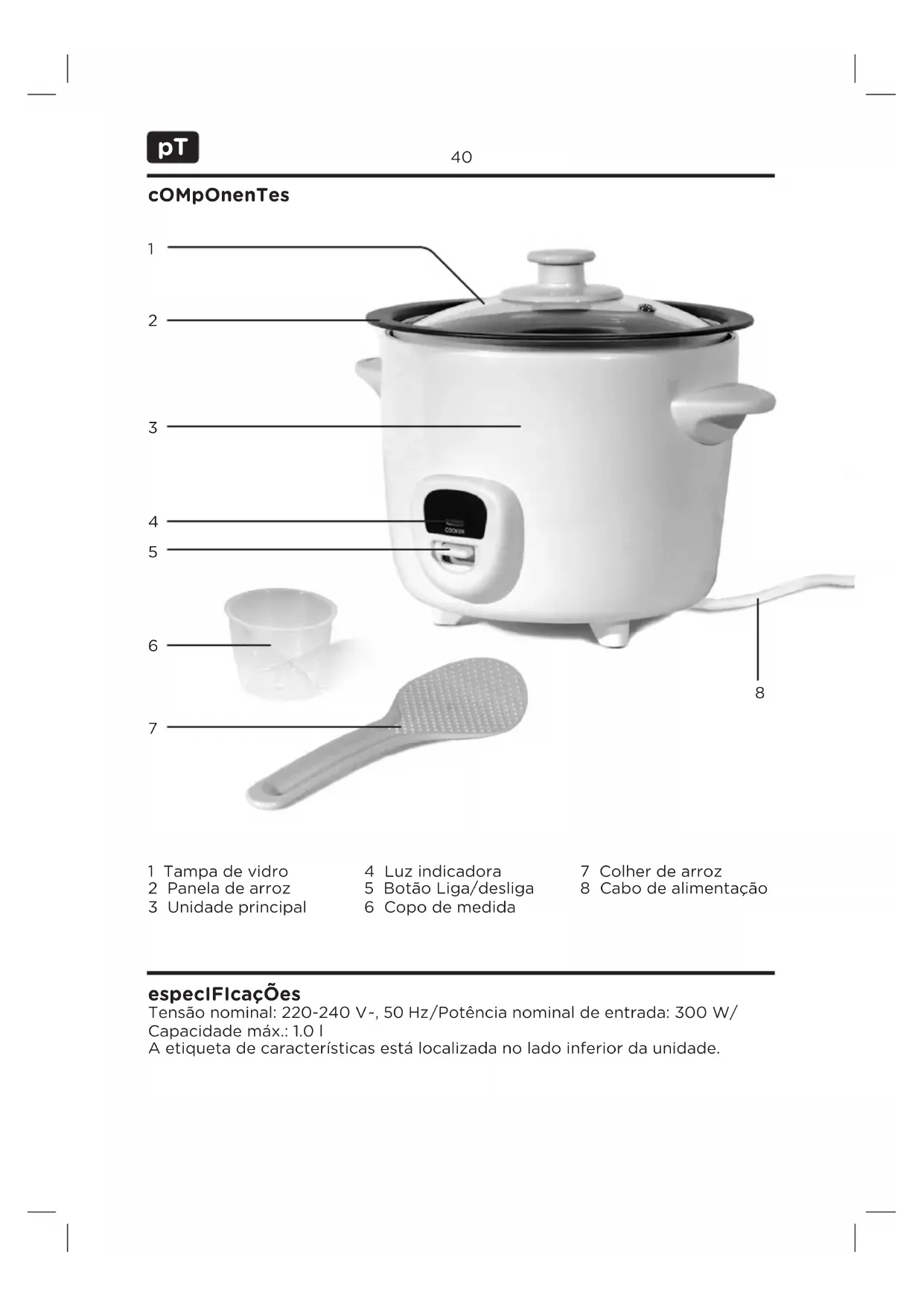 Tensão nominal: 220-240 V ~, 50 Hz /Potência nominal de entrada: 300 W/ Capacidade máx.: 1.0 l A etiqueta de características está localizada no lado inferior da unidade. especIFIcaçÕes 1 Tampa de vidro 2 Panela de arroz 3 Unidade principal 4 Luz indicadora 5 Botão Liga/desliga 6 Copo de medida 7 Colher de arroz 8 Cabo de alimentação