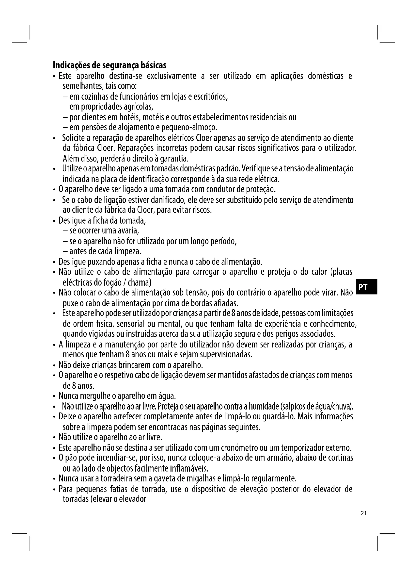 Os apareiros electricos Cloer cumprem as diretivas atuais da CE e as normas de segurança. No caso improvavel de o aparelho Cloer ter algoim defeito ou não funciona corretamente, entre em contacto com o revendedor ou com o service de atendimento ao cliente da fabrica da Cloer. Onoxso service de atendimento ao cliente da fabrica también está disponible para clientees regulares registados.