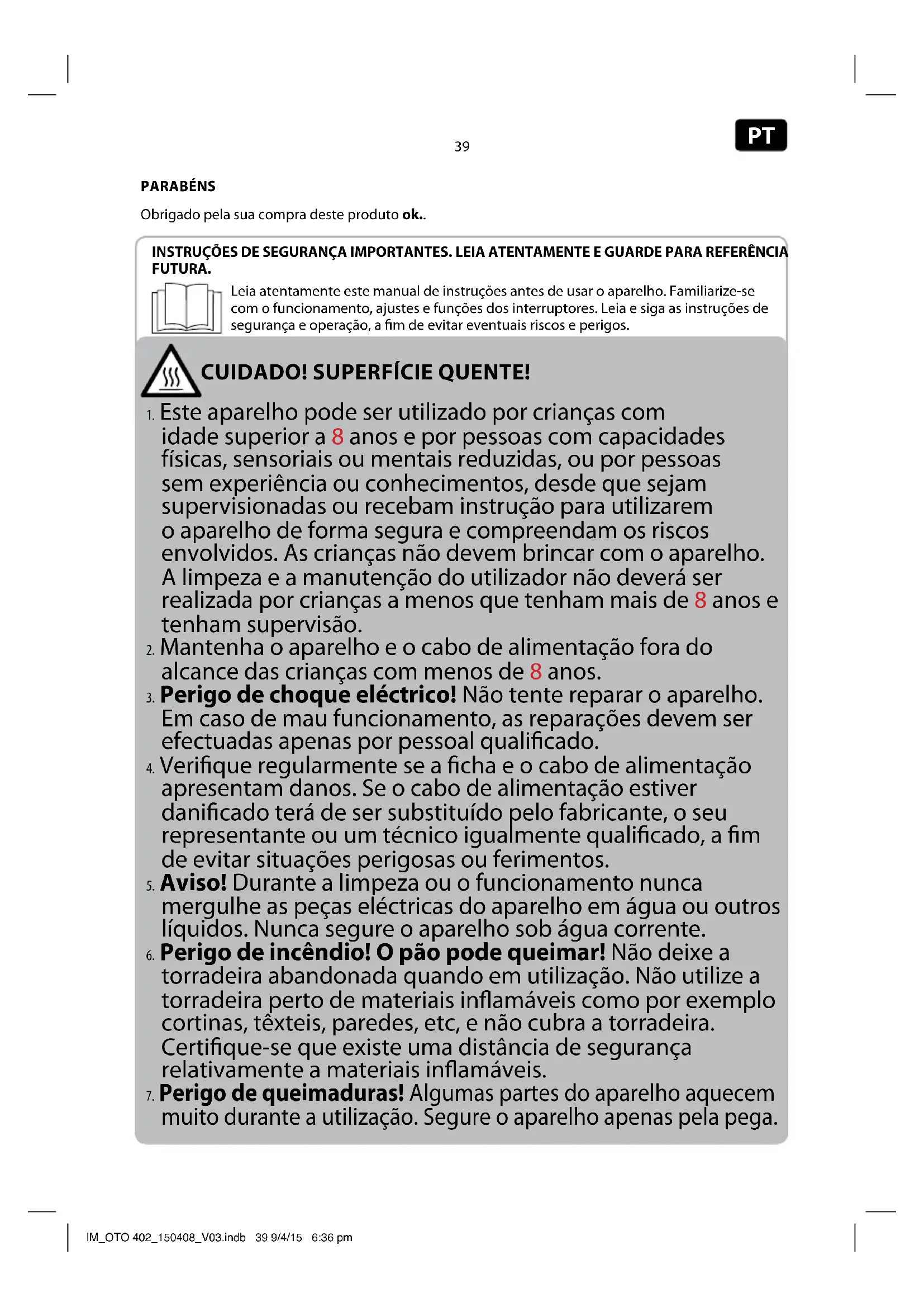 - Perigo de incendidio ou deCHOque elecrico! Nao insira fatias de pao mucho espessas. Nao insira pelicula de metal ou ferramentas na torradeira.