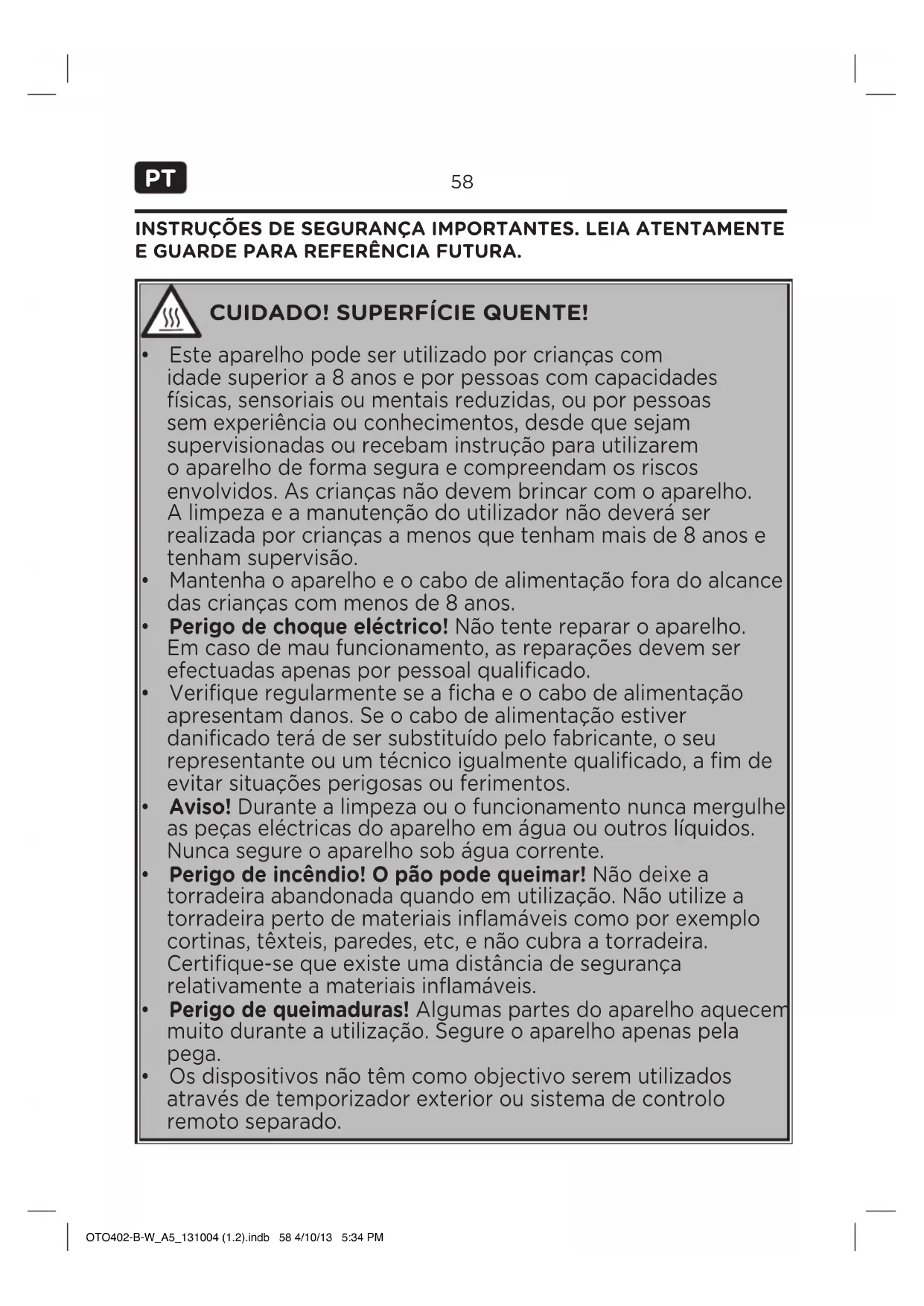 - Perigo de incêndio ou de choque eléctrico! Não insira fatias de pão muito espessas. Não insira película de metal ou ferramentas na torradeira.