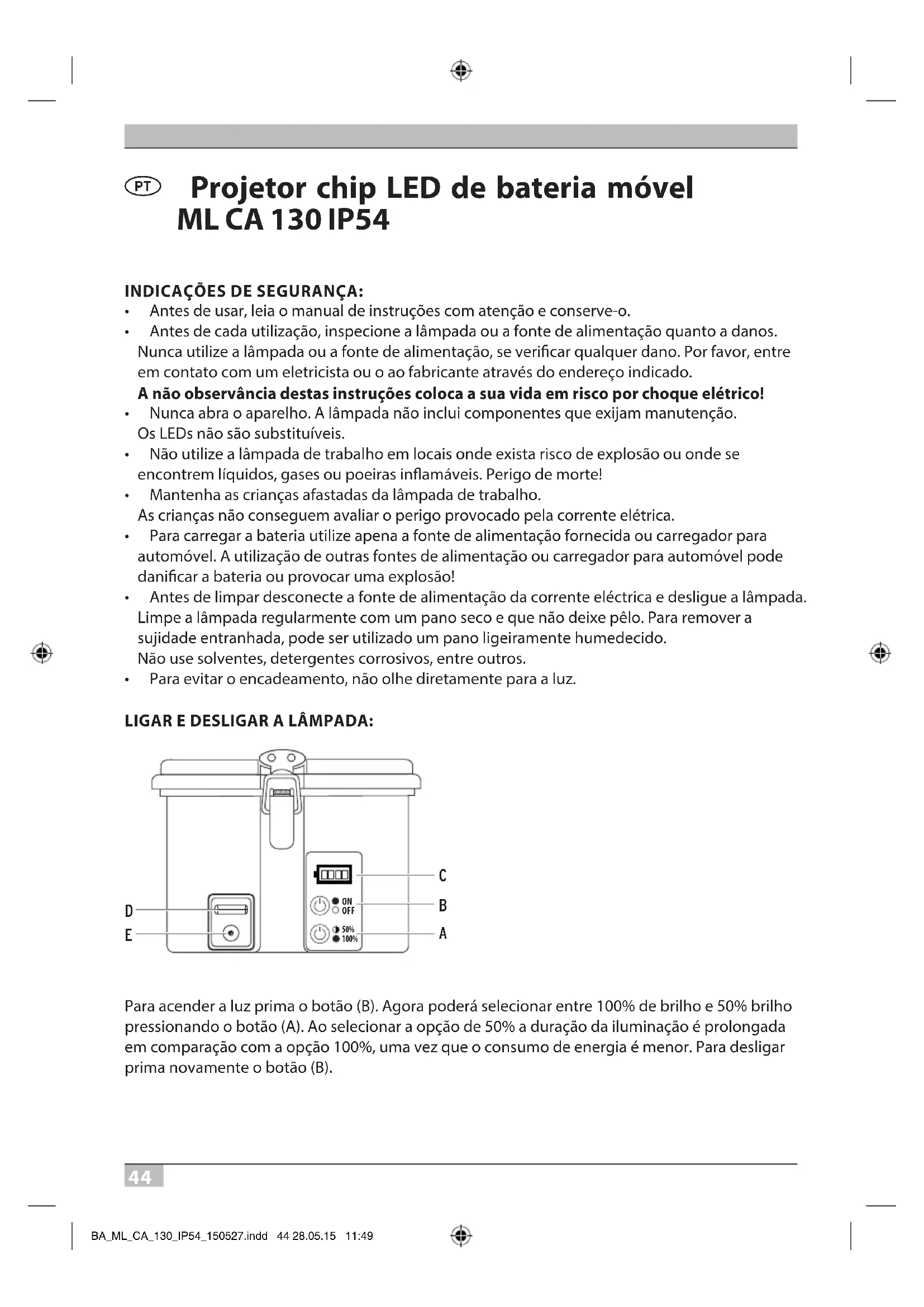 Projetor chip LED de bateria móvel ML CA 130 IP54 INDICAÇÕES DE SEGURANÇA: