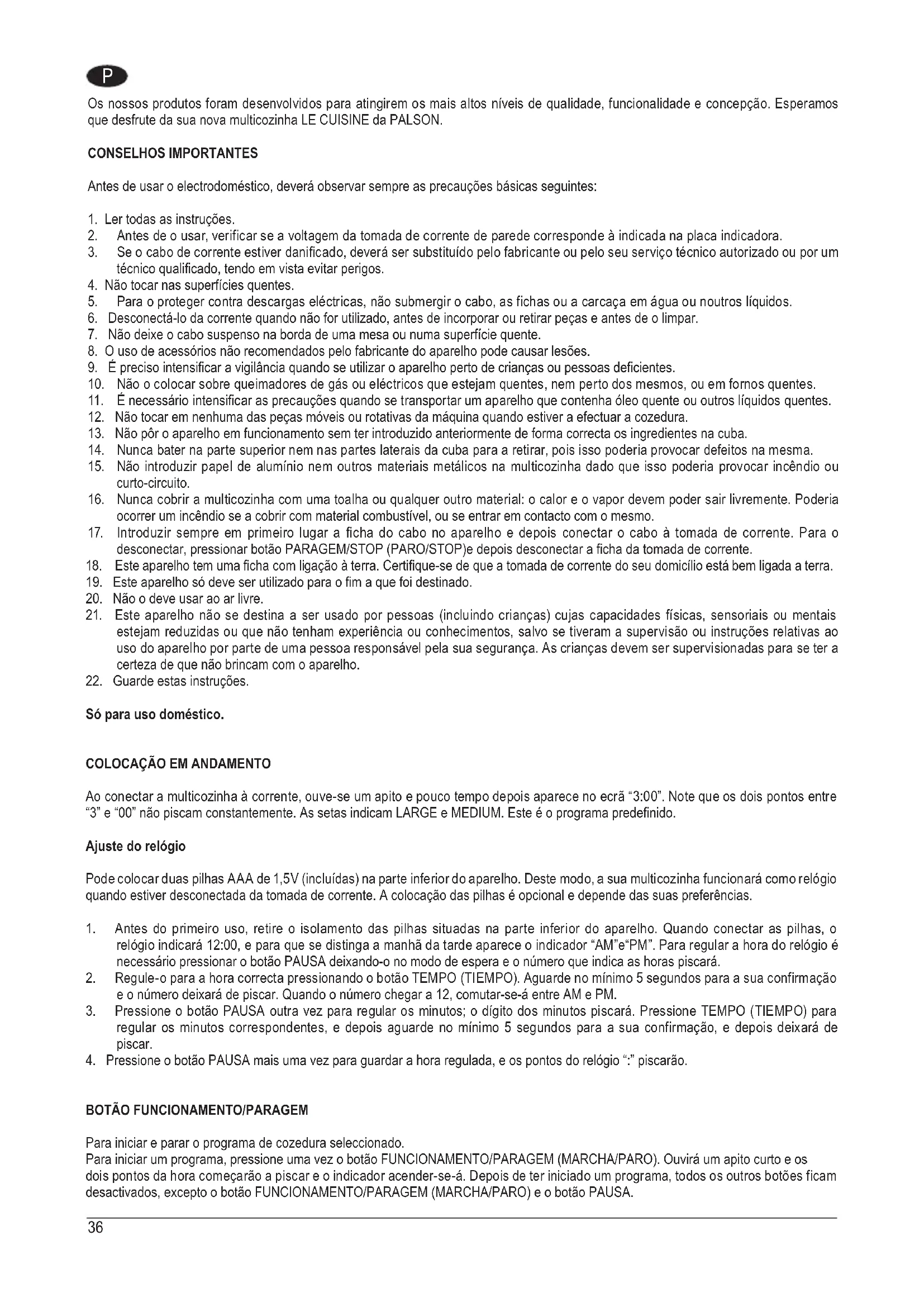 Os elesculos foram desenvolvidos para atingirem os mais altos niveis de qualidade, funciahde e concepao. Esperamos que desfrute da sua nova multicozinha LE CUISINE da PALSON.