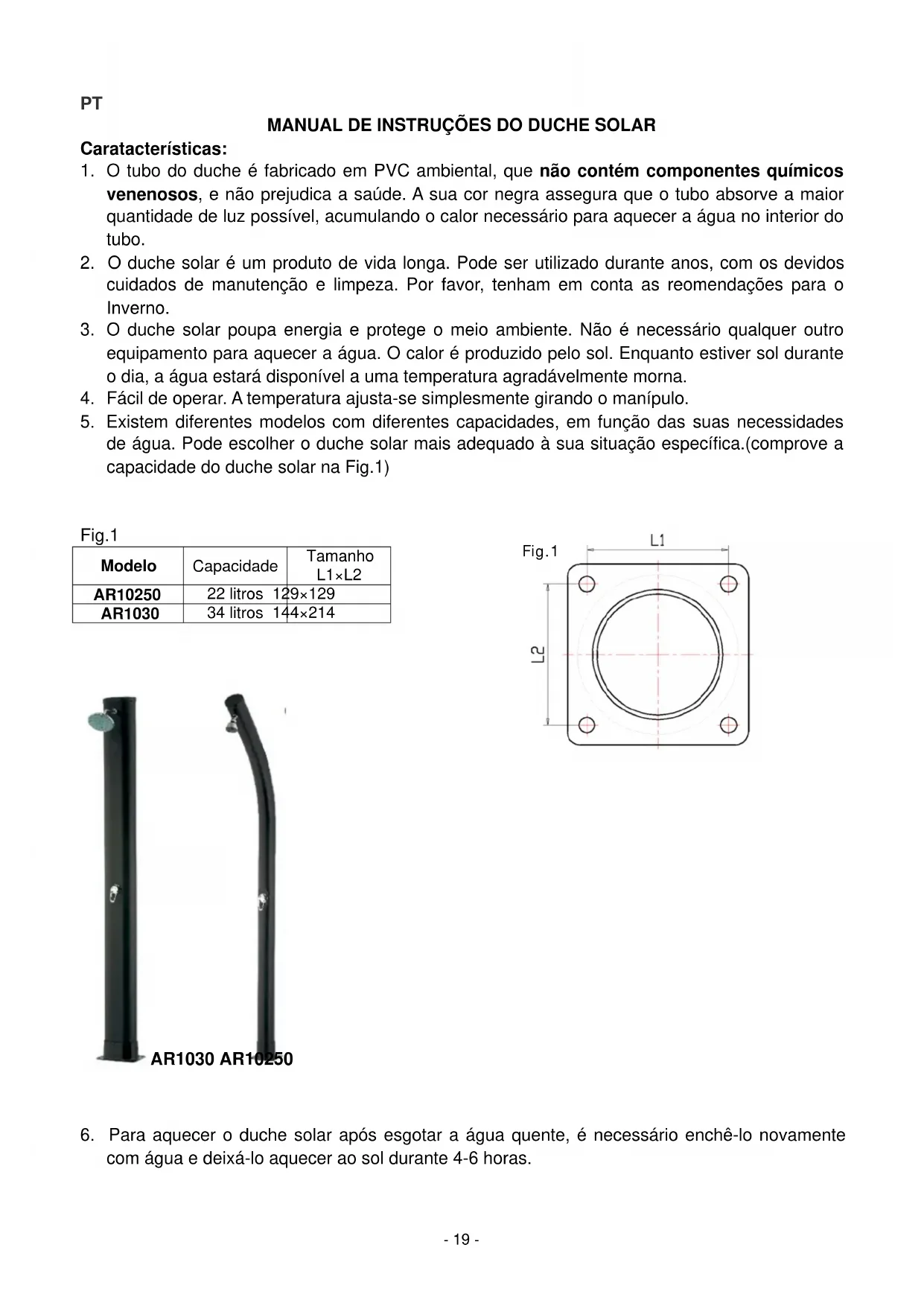 - ExistemDifferentesmodeloscomdiferentescapacidades,emfuncao dassusnecessidades deagua.Pode escolher o ducha solar mais adequado a sua situacaospecifica.(comprove acapacidadedo ducha solar na Fig.1)