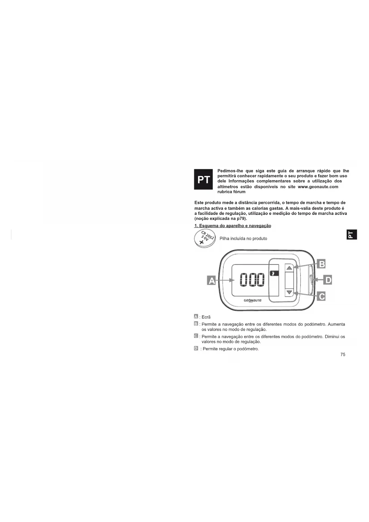 Pedimos-lhe que siga este guia de arranque rápido que lhe permitirá conhecer rapidamente o seu produto e fazer bom uso dele Informações complementares sobre a utilização dos altímetros estão disponíveis no site www.geonaute.com rubrica fórum Este produto mede a distância percorrida, o tempo de marcha e tempo de marcha activa e também as calorias gastas. A mais-valia deste produto é a facilidade de regulação, utilização e medição do tempo de marcha activa (noção explicada na p79).
