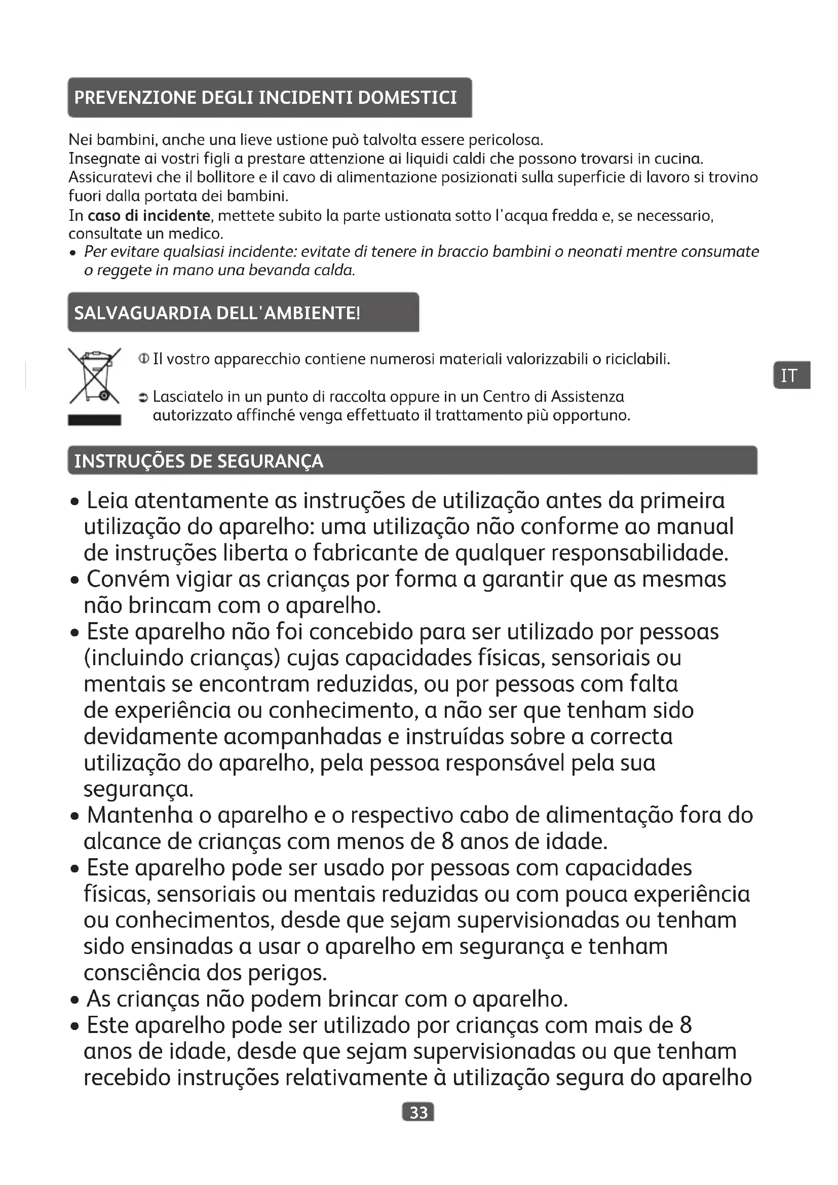 - Esteaparelhopodeserutilizadoporcriançascommaisde8 anosdeidade,desdequesejamsupervisionadasouquetenham recebidoinstruçõesrelativamenteàutilizaçãoseguradoaparelho IT34 ecompreendamosriscosenvolvidos.Alimpezaeamanutenção domesmoporpartedoutilizadornãodevemserrealizadas porcrianças,amenosquetenhammaisde8anosesejam supervisionadasporumadulto.