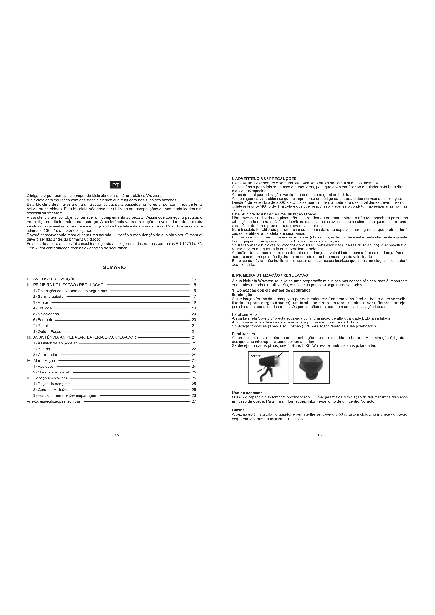 SUMÁRIO Obrigado e parabéns pela compra da bicicleta de assistência elétrica Wayscral. A bicicleta está equipada com assistência elétrica que o ajudará nas suas deslocações. Esta bicicleta destina-se a uma utilização lúdica, para passeios na floresta, por caminhos de terra batida ou na cidade. Esta bicicleta não deve ser utilizada em competições ou nas modalidades dirt, downhill ou freestyle. A assistência tem por objetivo fornecer um complemento ao pedalar. Assim que começar a pedalar, o motor liga-se, diminuindo o seu esforço. A assistência varia em função da velocidade da bicicleta, sendo considerável no arranque e menor quando a bicicleta está em andamento. Quando a velocidade atinge os 25Km/h, o motor desliga-se. Deverá conservar este manual para uma correta utilização e manutenção da sua bicicleta. O manual deverá ser lido antes da primeira utilização. Esta bicicleta para adultos foi concebida segundo as exigências das normas europeias EN 14764 e EN 15194, em conformidade com as exigências de segurança.