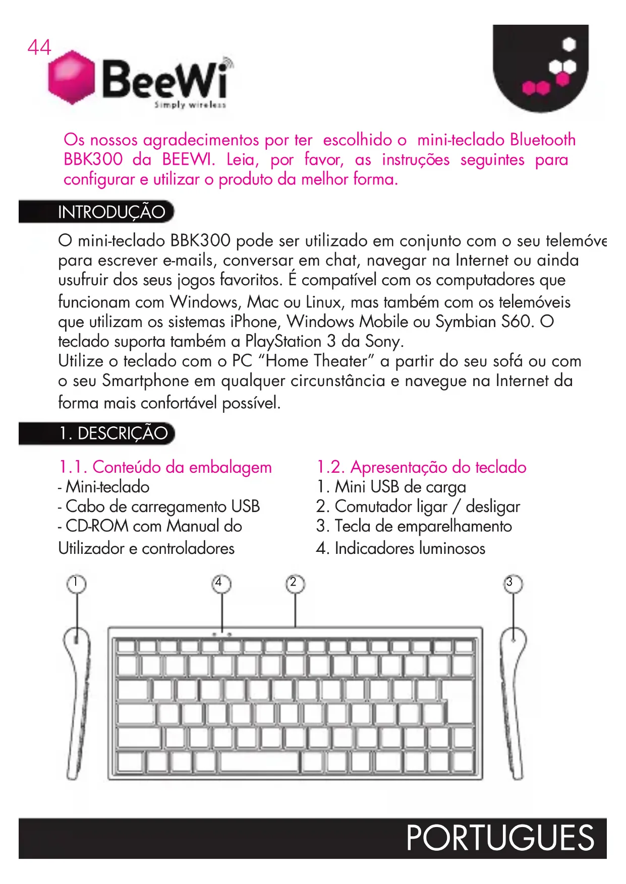 INTRODUÇÃO Os nossos agradecimentos por ter escolhido o mini-teclado Bluetooth BBK300 da BEEWI. Leia, por favor, as instruções seguintes para configurar e utilizar o produto da melhor forma.