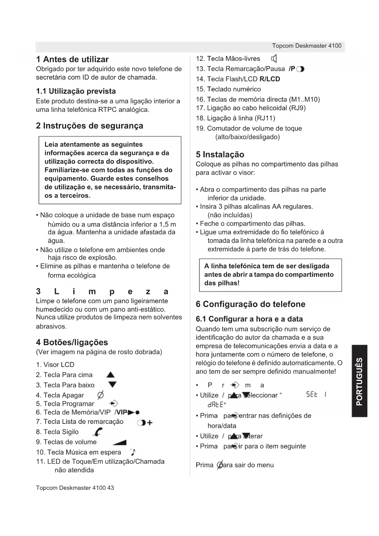 - Prima para ir para o item seguinte Prima para sair do menu Leia atentamente as seguintes informações acerca da segurança e da utilização correcta do dispositivo. Familiarize-se com todas as funções do equipamento. Guarde estes conselhos de utilização e, se necessário, transmita- os a terceiros. A linha telefónica tem de ser desligada antes de abrir a tampa do compartimento das pilhas!44 Topcom Deskmaster 4100 Topcom Deskmaster 4100