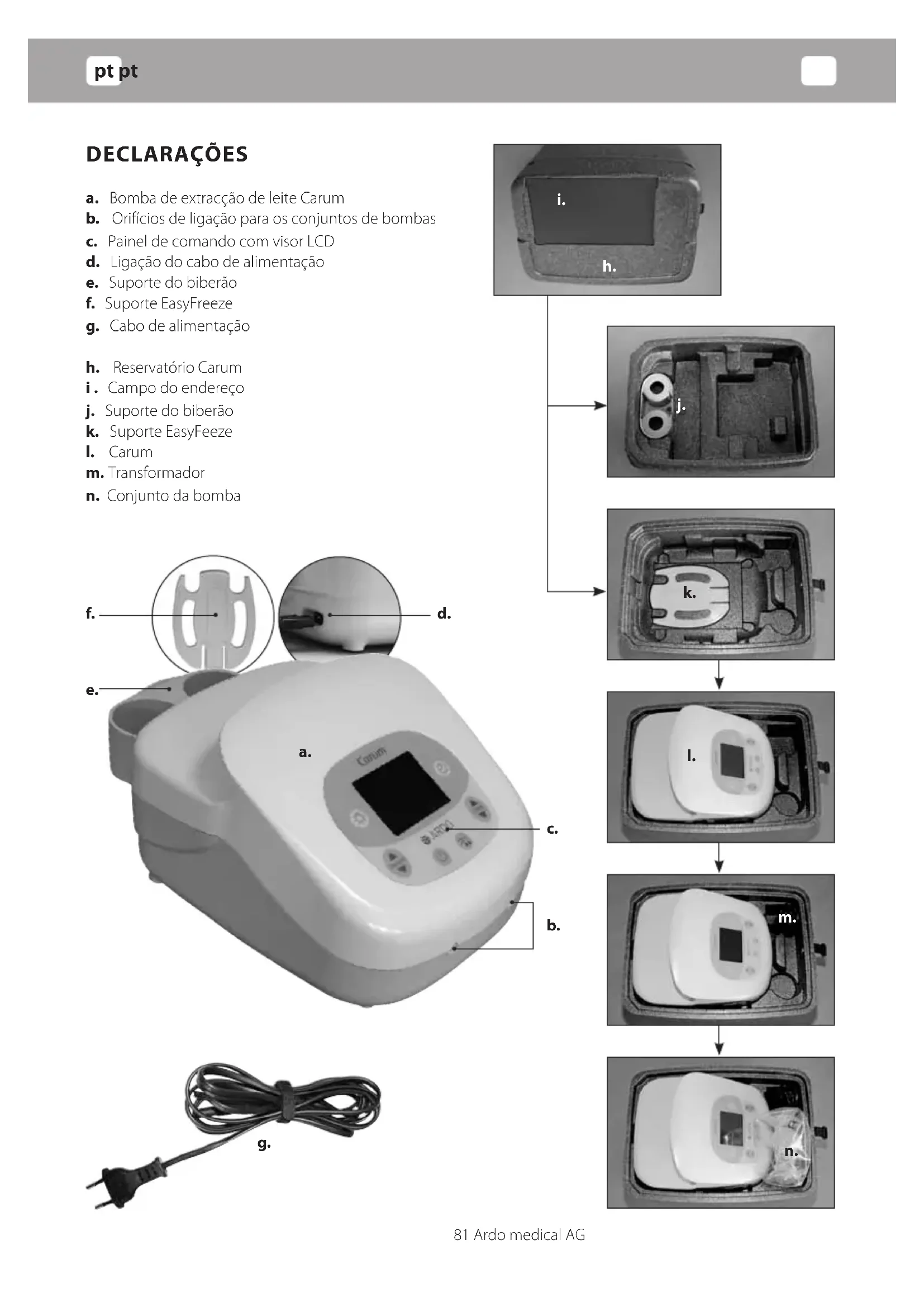 Para o transporte e o armazenamento do Carum, utilize por favor apenas a embalagem original. Aconselha-se um armazenamento protegido contra raios UV, calor e poeira. 11.1. Transporte e duração do período de armazenamento Carum e Carum com bateria recarregável opcional Temperatura -20 – +70°C Humidade relativa do ar 10 – 80% Pressão de ar 700 – 1060 hPa 11.2. Eliminação após decorrida a vida útil Para a eliminação do Carum, devolvê-lo ao fabricante ou desmontá-lo de forma não poluente por tipos de materiais de construção (metais, plásticos) e reciclá-lo através de uma firma de reciclagem de sistemas electrónicos.Nãoexistemriscosespeciaisouaumentados. Fabricante: Ardo medical AG Gewerbestrasse 19 6314 Unterägeri Switzerland Homepage: www.ardomedical.com E-mail: info@ardo.chtr tr 94 Ardo medical AG AÇIKLAMALAR a. Carum süt pompası b. PumpSet‘ler için bağlantı yerleri c. LCD ekranlı kumanda paneli d. Elektrik kablosu bağlantısı e. Şişe tutucu f. EasyFreeze tutucusu g. Elektrik kablosu h. Carum konteyneri