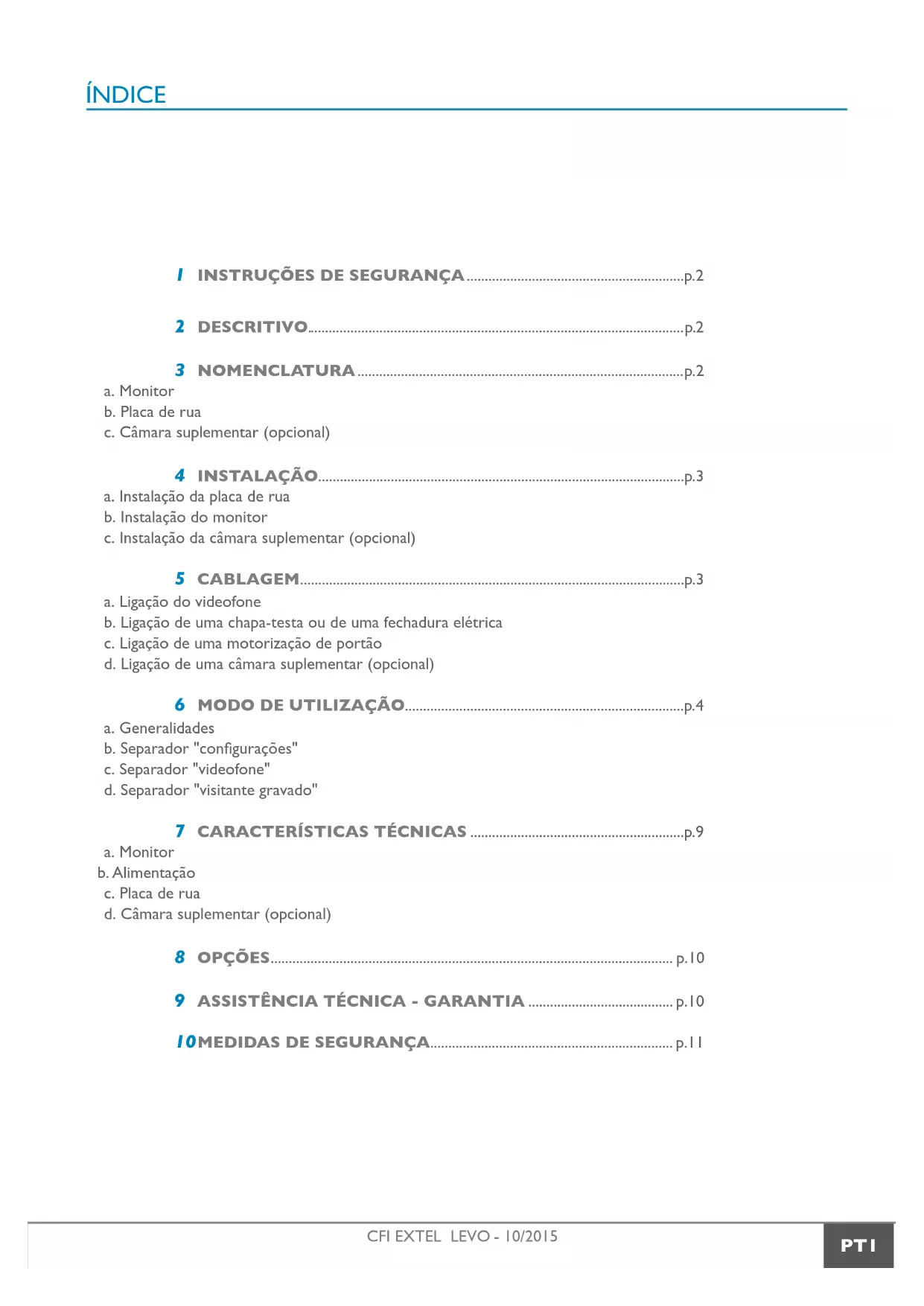 ÍNDICE 1 INSTRUÇÕES DE SEGURANÇA ............................................................p.2 2 DESCRITIVO. ....................................................................................................... p.2 3 NOMENCLATURA ..........................................................................................p.2 a. Monitor b. Placa de rua c. Câmara suplementar (opcional) 4 INSTALAÇÃO.....................................................................................................p.3 a. Instalação da placa de rua b. Instalação do monitor c. Instalação da câmara suplementar (opcional) 5 CABLAGEM ..........................................................................................................p.3 a. Ligação do videofone b. Ligação de uma chapa-testa ou de uma fechadura elétrica c. Ligação de uma motorização de portão d. Ligação de uma câmara suplementar (opcional) 6 MODO DE UTILIZAÇÃO.............................................................................p.4 a. Generalidades b. Separador "congurações" c. Separador "videofone" d. Separador "visitante gravado" 7 CARACTERÍSTICAS TÉCNICAS ...........................................................p.9 a. Monitor b. Alimentação c. Placa de rua d. Câmara suplementar (opcional) 8 OPÇÕES ............................................................................................................... p.10 9 ASSISTÊNCIA TÉCNICA - GARANTIA ........................................ p.10 10 MEDIDAS DE SEGURANÇA ................................................................... p.11PT2