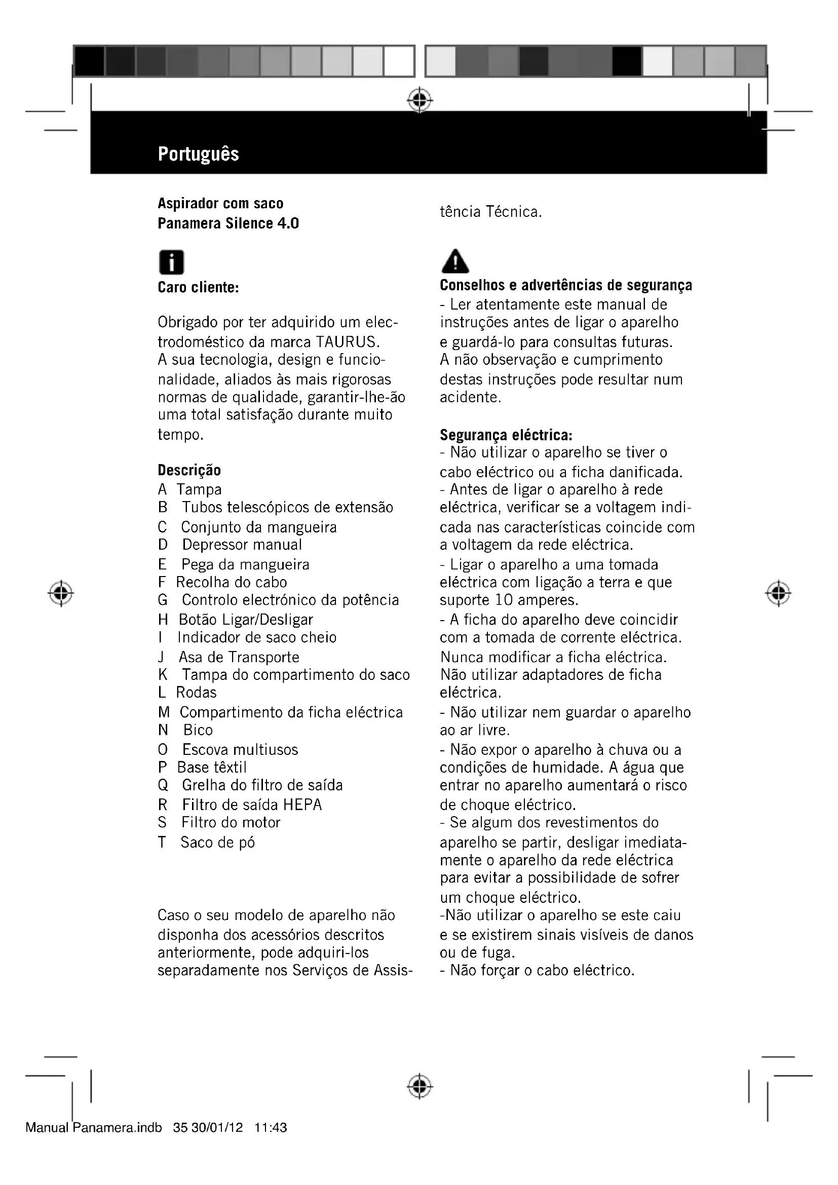 70,8 700Português Aspirador com saco Panamera Silence 4.0 Caro cliente: Obrigado por ter adquirido um elec- trodoméstico da marca TAURUS. A sua tecnologia, design e funcio- nalidade, aliados às mais rigorosas normas de qualidade, garantir-lhe-ão uma total satisfação durante muito tempo. Descrição A Tampa B Tubos telescópicos de extensão C Conjunto da mangueira D Depressor manual E Pega da mangueira F Recolha do cabo G Controlo electrónico da potência H Botão Ligar/Desligar I Indicador de saco cheio J Asa de Transporte K Tampa do compartimento do saco L Rodas M Compartimento da ficha eléctrica N Bico O Escova multiusos P Base têxtil Q Grelha do filtro de saída R Filtro de saída HEPA S Filtro do motor T Saco de pó