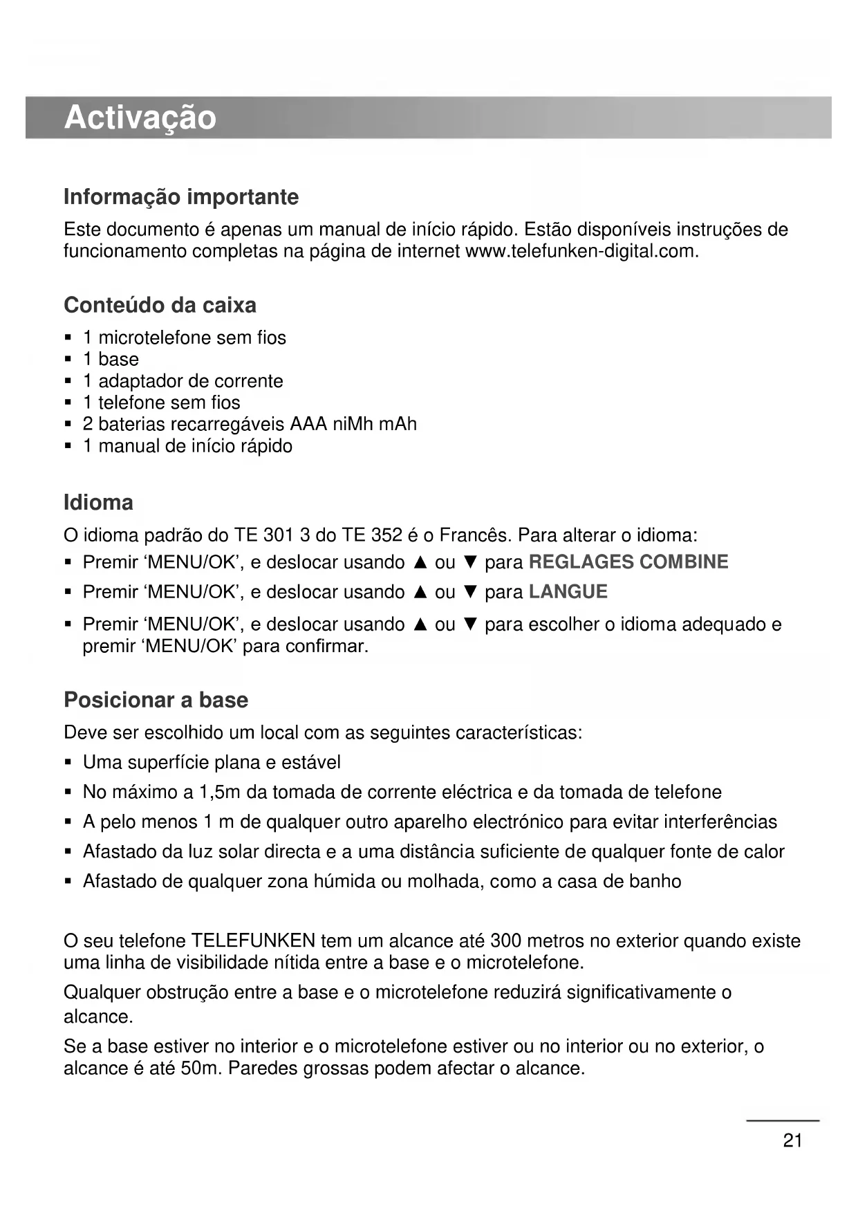 Activação Informação importante Este documento é apenas um manual de início rápido. Estão disponíveis instruções de funcionamento completas na página de internet www.telefunken-digital.com. Conteúdo da caixa 1 microtelefone sem fios 1 base 1 adaptador de corrente 1 telefone sem fios 2 baterias recarregáveis AAA niMh mAh 1 manual de início rápido Idioma O idioma padrão do TE 301 3 do TE 352 é o Francês. Para alterar o idioma: Premir ‘MENU/OK’, e deslocar usando ▲ ou ▼ para REGLAGES COMBINE Premir ‘MENU/OK’, e deslocar usando ▲ ou ▼ para LANGUE Premir ‘MENU/OK’, e deslocar usando ▲ ou ▼ para escolher o idioma adequado e premir ‘MENU/OK’ para confirmar. Posicionar a base Deve ser escolhido um local com as seguintes características: Uma superfície plana e estável No máximo a 1,5m da tomada de corrente eléctrica e da tomada de telefone A pelo menos 1 m de qualquer outro aparelho electrónico para evitar interferências Afastado da luz solar directa e a uma distância suficiente de qualquer fonte de calor Afastado de qualquer zona húmida ou molhada, como a casa de banho O seu telefone TELEFUNKEN tem um alcance até 300 metros no exterior quando existe uma linha de visibilidade nítida entre a base e o microtelefone. Qualquer obstrução entre a base e o microtelefone reduzirá significativamente o alcance. Se a base estiver no interior e o microtelefone estiver ou no interior ou no exterior, o alcance é até 50m. Paredes grossas podem afectar o alcance.22