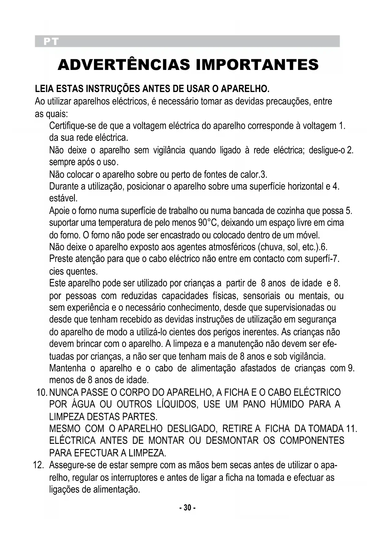 Não colocar o aparelho sobre ou perto de fontes de calor.3. Durante a utilização, posicionar o aparelho sobre uma superfície horizontal e 4. estável. Apoie o forno numa superfície de trabalho ou numa bancada de cozinha que possa 5. suportar uma temperatura de pelo menos 90°C, deixando um espaço livre em cima do forno. O forno não pode ser encastrado ou colocado dentro de um móvel. Não deixe o aparelho exposto aos agentes atmosféricos (chuva, sol, etc.).6. Preste atenção para que o cabo eléctrico não entre em contacto com superfí-7. cies quentes. Este aparelho pode ser utilizado por crianças a partir de 8 anos de idade e 8. por pessoas com reduzidas capacidades físicas, sensoriais ou mentais, ou sem experiência e o necessário conhecimento, desde que supervisionadas ou desde que tenham recebido as devidas instruções de utilização em segurança do aparelho de modo a utilizá-lo cientes dos perigos inerentes. As crianças não devem brincar com o aparelho. A limpeza e a manutenção não devem ser efe- tuadas por crianças, a não ser que tenham mais de 8 anos e sob vigilância. Mantenha o aparelho e o cabo de alimentação afastados de crianças com 9. menos de 8 anos de idade. NUNCA PASSE O CORPO DO APARELHO, A FICHA E O CABO ELÉCTRICO 10. POR ÁGUA OU OUTROS LÍQUIDOS, USE UM PANO HÚMIDO PARA A LIMPEZA DESTAS PARTES. MESMO COM O APARELHO DESLIGADO, RETIRE A FICHA DA TOMADA 11. ELÉCTRICA ANTES DE MONTAR OU DESMONTAR OS COMPONENTES PARA EFECTUAR A LIMPEZA. Assegure-se de estar sempre com as mãos bem secas antes de utilizar o apa-12. relho, regular os interruptores e antes de ligar a ficha na tomada e efectuar as ligações de alimentação.PT