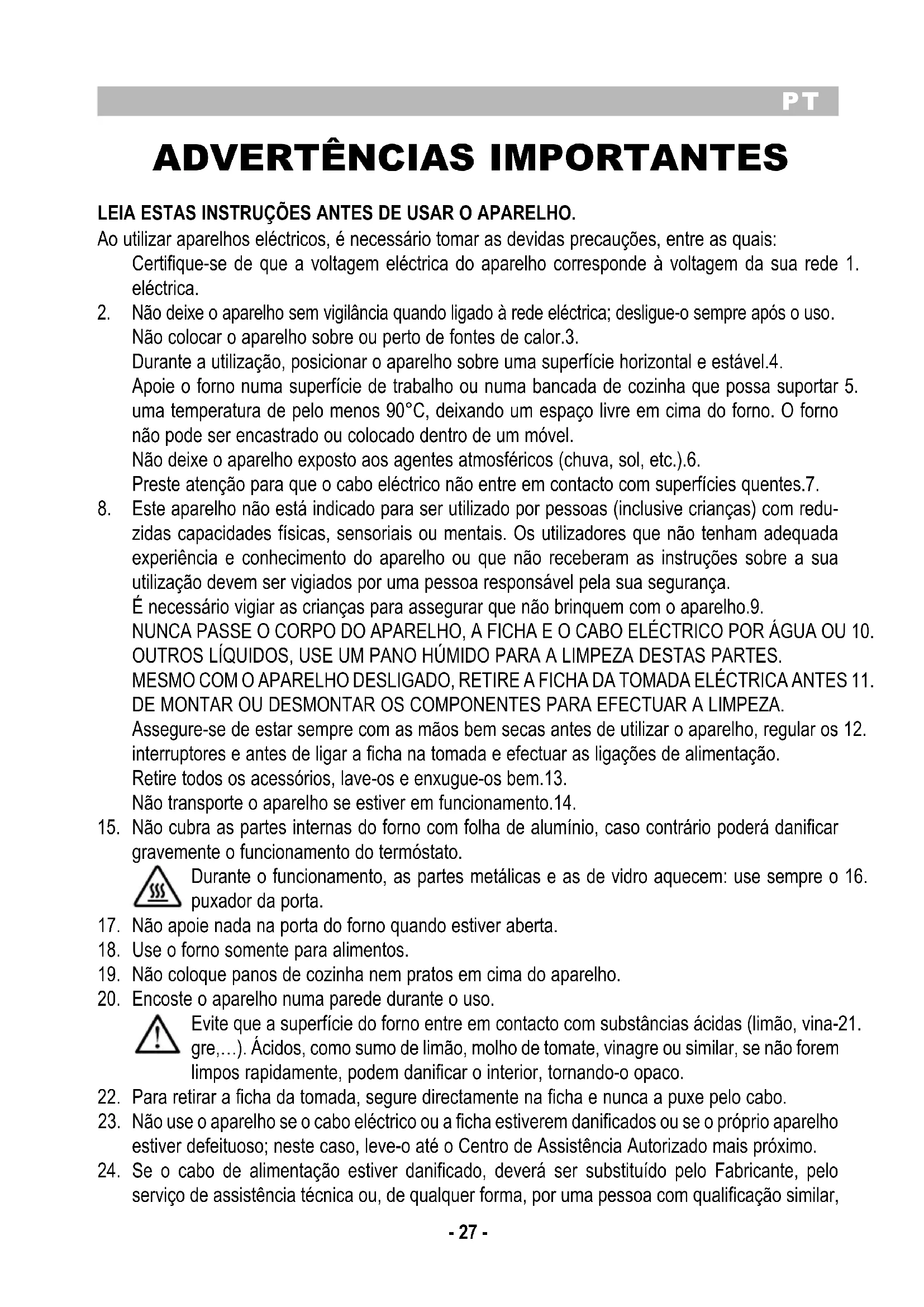 Não colocar o aparelho sobre ou perto de fontes de calor.3. Durante a utilização, posicionar o aparelho sobre uma superfície horizontal e estável.4. Apoie o forno numa superfície de trabalho ou numa bancada de cozinha que possa suportar 5. uma temperatura de pelo menos 90°C, deixando um espaço livre em cima do forno. O forno não pode ser encastrado ou colocado dentro de um móvel. Não deixe o aparelho exposto aos agentes atmosféricos (chuva, sol, etc.).6. Preste atenção para que o cabo eléctrico não entre em contacto com superfícies quentes.7. Este aparelho não está indicado para ser utilizado por pessoas (inclusive crianças) com redu-8. zidas capacidades físicas, sensoriais ou mentais. Os utilizadores que não tenham adequada experiência e conhecimento do aparelho ou que não receberam as instruções sobre a sua utilização devem ser vigiados por uma pessoa responsável pela sua segurança. É necessário vigiar as crianças para assegurar que não brinquem com o aparelho.9. NUNCA PASSE O CORPO DO APARELHO, A FICHA E O CABO ELÉCTRICO POR ÁGUA OU 10. OUTROS LÍQUIDOS, USE UM PANO HÚMIDO PARA A LIMPEZA DESTAS PARTES. MESMO COM O APARELHO DESLIGADO, RETIRE A FICHA DA TOMADA ELÉCTRICA ANTES 11. DE MONTAR OU DESMONTAR OS COMPONENTES PARA EFECTUAR A LIMPEZA. Assegure-se de estar sempre com as mãos bem secas antes de utilizar o aparelho, regular os 12. interruptores e antes de ligar a ficha na tomada e efectuar as ligações de alimentação. Retire todos os acessórios, lave-os e enxugue-os bem.13. Não transporte o aparelho se estiver em funcionamento.14. Não cubra as partes internas do forno com folha de alumínio, caso contrário poderá danificar 15. gravemente o funcionamento do termóstato. Durante o funcionamento, as partes metálicas e as de vidro aquecem: use sempre o 16. puxador da porta. Não apoie nada na porta do forno quando estiver aberta.17. Use o forno somente para alimentos.18. Não coloque panos de cozinha nem pratos em cima do aparelho.19. Encoste o aparelho numa parede durante o uso.20. Evite que a superfície do forno entre em contacto com substâncias ácidas (limão, vina-21. gre,…). Ácidos, como sumo de limão, molho de tomate, vinagre ou similar, se não forem limpos rapidamente, podem danificar o interior, tornando-o opaco. Para retirar a ficha da tomada, segure directamente na ficha e nunca a puxe pelo cabo.22. Não use o aparelho se o cabo eléctrico ou a ficha estiverem danificados ou se o próprio aparelho 23. estiver defeituoso; neste caso, leve-o até o Centro de Assistência Autorizado mais próximo. Se o cabo de alimentação estiver danificado, deverá ser substituído pelo Fabricante, pelo 24. serviço de assistência técnica ou, de qualquer forma, por uma pessoa com qualificação similar,PT