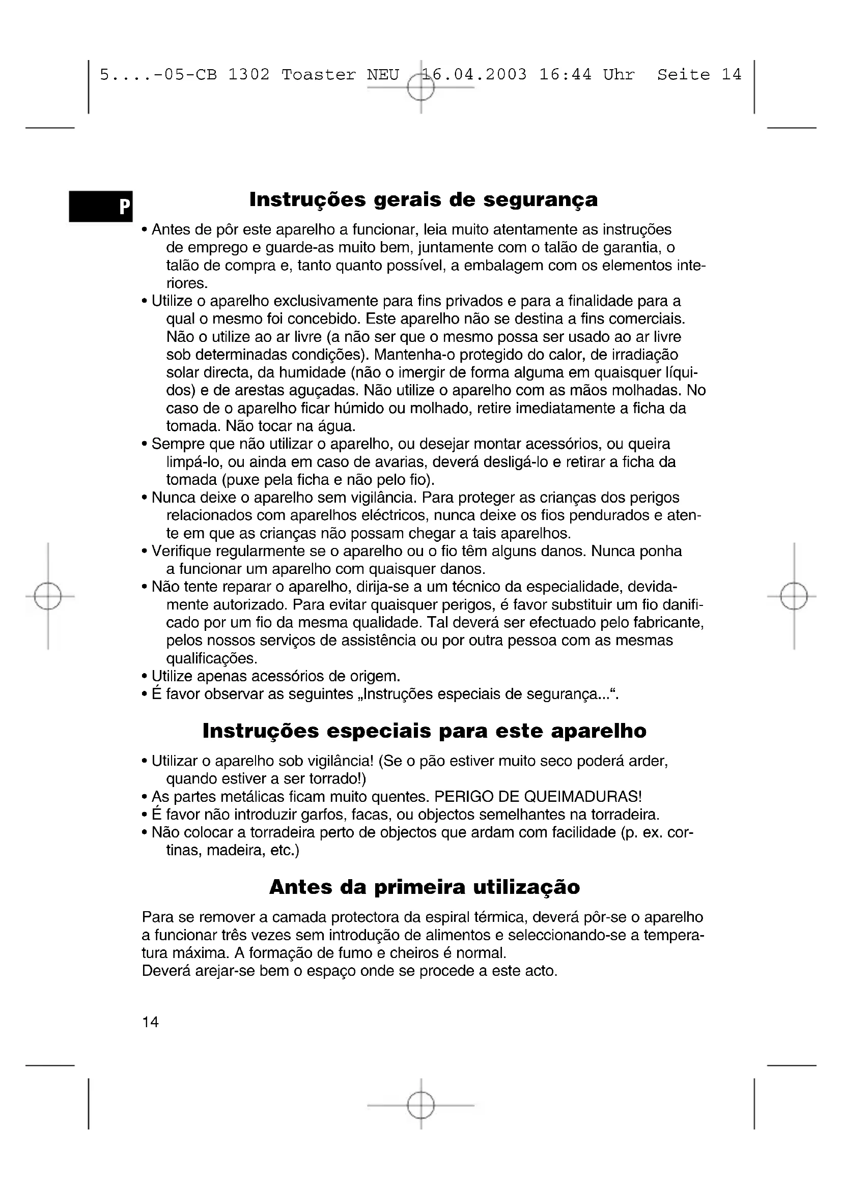 5....-05-CB 1302 Toaster NEU 16.04.2003 16:44 Uhr Seite 15Este aparelho obedece às normas da CE para eliminação de interferências e segurança de baixa tensão e foi fabricado de acordo com os regulamentos mais recentes da técnica de segurança. Reserva-se o direito de alterações! Garantia O aparelho vendido pela nossa empresa tem uma garantia de 24 meses a partir da data da compra (talão). Durante o período de garantia, procederemos à remoção grátis - quer por repa- ração, quer por substituição - de todas as deficiências do aparelho que provenham de erros de material ou de fabricação. O talão de compra consistirá prova desta garantia. Sem o mesmo, não será pos- sível proceder-se a qualquer troca ou reparação grátis. No caso de querer fazer valer a garantia, é favor entregar o aparelho completo na embalagem original, juntamente com o talão de compra, na loja onde aquele tenha sido comprado. Em caso de danos em peças de vidro ou de defeitos em quaisquer acessórios, não será efectuada a substituição do aparelho. Os mesmos serão trocados e expe- didos gratuitamente. Não enviar neste caso o aparelho para a fábrica; bastará encomendar o acessório em questão! Não estão incluídas na garantia a limpeza, a manutenção ou a troca de peças que se desgastem, devendo tais despesas ser reembolsadas. A garantia deixará de ter validade, sempre que tenha havido intervenção alheia no aparelho. Após a garantia Após a expiração do prazo de garantia, poderão ser efectuados arranjos por pes- soal especializado, ou pelos nossos serviços de reparações, contra reembolso.