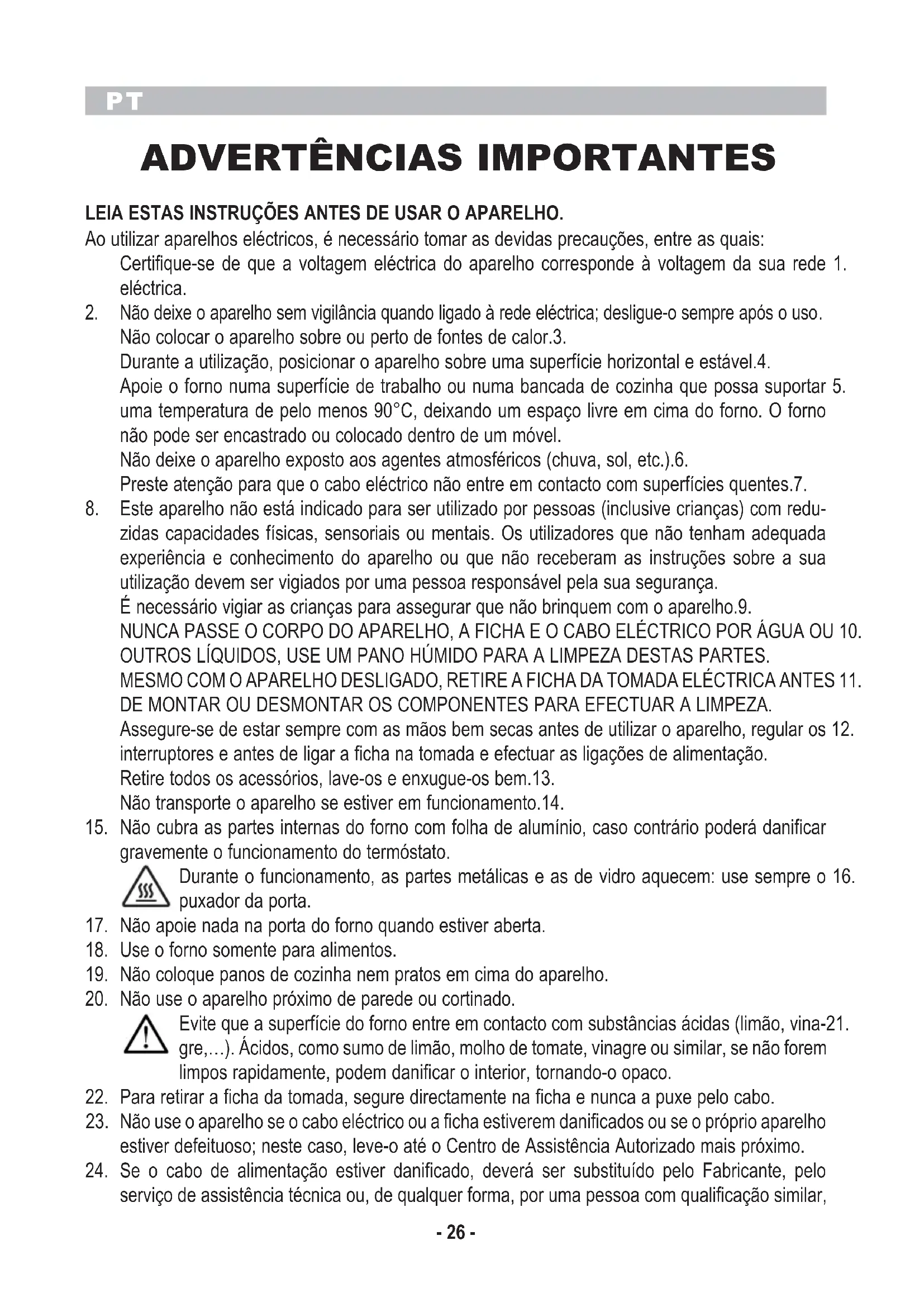 Não colocar o aparelho sobre ou perto de fontes de calor.3. Durante a utilização, posicionar o aparelho sobre uma superfície horizontal e estável.4. Apoie o forno numa superfície de trabalho ou numa bancada de cozinha que possa suportar 5. uma temperatura de pelo menos 90°C, deixando um espaço livre em cima do forno. O forno não pode ser encastrado ou colocado dentro de um móvel. Não deixe o aparelho exposto aos agentes atmosféricos (chuva, sol, etc.).6. Preste atenção para que o cabo eléctrico não entre em contacto com superfícies quentes.7. Este aparelho não está indicado para ser utilizado por pessoas (inclusive crianças) com redu-8. zidas capacidades físicas, sensoriais ou mentais. Os utilizadores que não tenham adequada experiência e conhecimento do aparelho ou que não receberam as instruções sobre a sua utilização devem ser vigiados por uma pessoa responsável pela sua segurança. É necessário vigiar as crianças para assegurar que não brinquem com o aparelho.9. NUNCA PASSE O CORPO DO APARELHO, A FICHA E O CABO ELÉCTRICO POR ÁGUA OU 10. OUTROS LÍQUIDOS, USE UM PANO HÚMIDO PARA A LIMPEZA DESTAS PARTES. MESMO COM O APARELHO DESLIGADO, RETIRE A FICHA DA TOMADA ELÉCTRICA ANTES 11. DE MONTAR OU DESMONTAR OS COMPONENTES PARA EFECTUAR A LIMPEZA. Assegure-se de estar sempre com as mãos bem secas antes de utilizar o aparelho, regular os 12. interruptores e antes de ligar a ficha na tomada e efectuar as ligações de alimentação. Retire todos os acessórios, lave-os e enxugue-os bem.13. Não transporte o aparelho se estiver em funcionamento.14. Não cubra as partes internas do forno com folha de alumínio, caso contrário poderá danificar 15. gravemente o funcionamento do termóstato. Durante o funcionamento, as partes metálicas e as de vidro aquecem: use sempre o 16. puxador da porta. Não apoie nada na porta do forno quando estiver aberta.17. Use o forno somente para alimentos.18. Não coloque panos de cozinha nem pratos em cima do aparelho.19. Não use o aparelho próximo de parede ou cortinado.20. Evite que a superfície do forno entre em contacto com substâncias ácidas (limão, vina-21. gre,…). Ácidos, como sumo de limão, molho de tomate, vinagre ou similar, se não forem limpos rapidamente, podem danificar o interior, tornando-o opaco. Para retirar a ficha da tomada, segure directamente na ficha e nunca a puxe pelo cabo.22. Não use o aparelho se o cabo eléctrico ou a ficha estiverem danificados ou se o próprio aparelho 23. estiver defeituoso; neste caso, leve-o até o Centro de Assistência Autorizado mais próximo. Se o cabo de alimentação estiver danificado, deverá ser substituído pelo Fabricante, pelo 24. serviço de assistência técnica ou, de qualquer forma, por uma pessoa com qualificação similar,PT