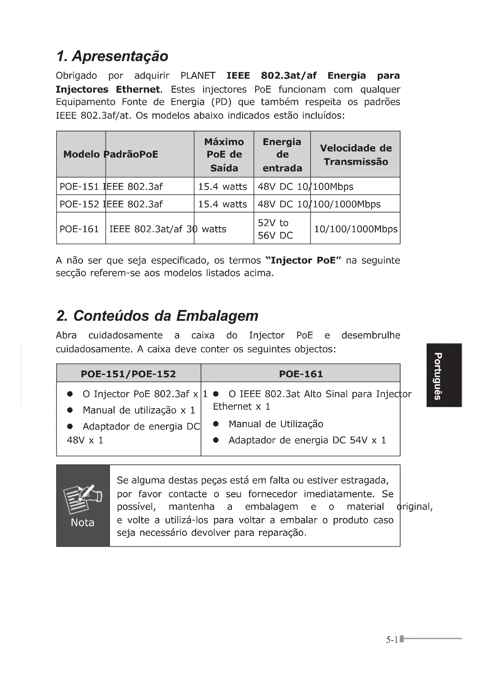 | • O Injector PoE 802.3af x • Manual de'utilização x 1 • Adaptador de energia DC 48V x 1 | 1 • O IEEE 802.3at Alto Sinal para Injec Ethernet x 1 • Manual de Utilização • Adaptador de energia DC 54V x 1 |