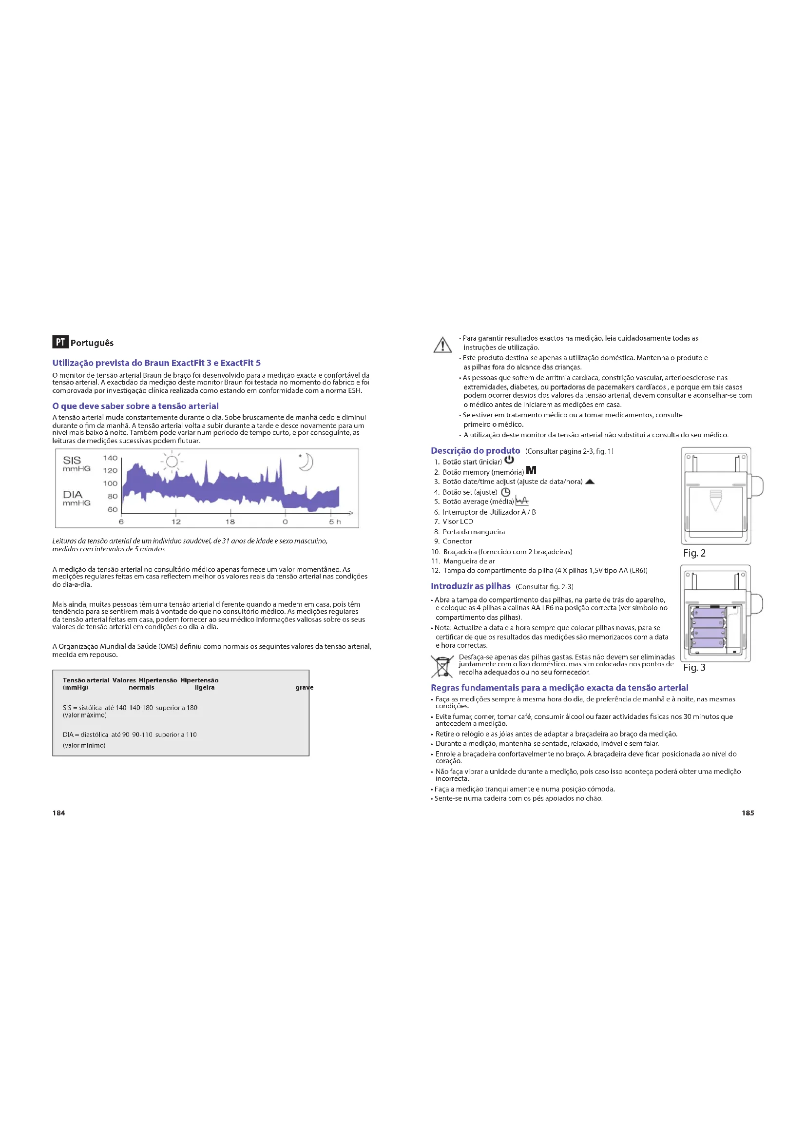 Português Utilização prevista do Braun ExactFit 3 e ExactFit 5 O monitor de tensão arterial Braun de braço foi desenvolvido para a medição exacta e confortável da tensão arterial. A exactidão da medição deste monitor Braun foi testada no momento do fabrico e foi comprovada por investigação clínica realizada como estando em conformidade com a norma ESH. O que deve saber sobre a tensão arterial A tensão arterial muda constantemente durante o dia. Sobe bruscamente de manhã cedo e diminui durante o m da manhã. A tensão arterial volta a subir durante a tarde e desce novamente para um nível mais baixo à noite. Também pode variar num período de tempo curto, e por conseguinte, as leituras de medições sucessivas podem utuar. Leituras da tensão arterial de um indivíduo saudável, de 31 anos de idade e sexo masculino, medidas com intervalos de 5 minutos A medição da tensão arterial no consultório médico apenas fornece um valor momentâneo. As medições regulares feitas em casa reectem melhor os valores reais da tensão arterial nas condições do dia-a-dia. Mais ainda, muitas pessoas têm uma tensão arterial diferente quando a medem em casa, pois têm tendência para se sentirem mais à vontade do que no consultório médico. As medições regulares da tensão arterial feitas em casa, podem fornecer ao seu médico informações valiosas sobre os seus valores de tensão arterial em condições do dia-a-dia. A Organização Mundial da Saúde (OMS) deniu como normais os seguintes valores da tensão arterial, medida em repouso. Tensão arterial Valores Hipertensão Hipertensão (mmHg) normais ligeira grave SIS = sistólica até 140 140-180 superior a 180 (valor máximo) DIA = diastólica até 90 90-110 superior a 110 (valor mínimo)