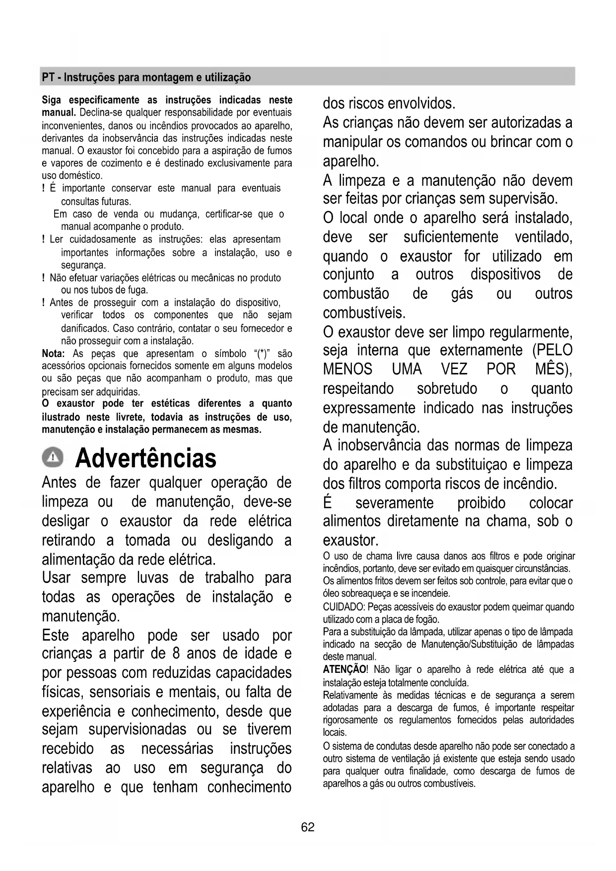 PRODUCTOS QUE CONTENGAN CLORO! Filtro antigrasa Fig. 25-26-27 Retiene las partículas de grasa producidas cuando se cocina. Se debe limpiar al menos una vez al mes (o cuando el sistema de indicación de saturación de los filtros – si se contempla en el modelo que se tiene – lo indica), con detergentes no agresivos, en lavavajillas con temperaturas bajas y ciclo breve (Tmáx.: 70 °C) Con el lavado en lavavajillas las partes metálicas podrían descolorarse. El filtro se debe secar en el horno a una temperatura máx. de 100 °C durante una hora; repita la operación si el filtro aún está húmedo. Sustituya el filtro al menos cada 2 años. ¡Atención! Después de realizar el mantenimiento del filtro, instale en el recipiente apropiado PRIMERO el filtro antigrasa, DESPUÉS el filtro de carbón. Este último se puede reconocer ya que está sellado dentro de una malla. Compruebe que cuando se haya colocado el recipiente, solo se pueda ver el filtro antigrasa. Filtro al carbón activo (solamente para la versión filtrante) Fig. 25-26-27 Retiene los olores desagradables producidos por la cocción de alimentos. ¡Atención! El filtro de carbón activo se puede reconocer porque está sellado dentro de una malla específica. Realice las operaciones de desmontaje, mantenimiento y limpieza del filtro manipulando el filtro con mucho cuidado para no estropear o abrir la malla. El filtro al carbón puede lavarse cada dos meses (o cuando el sistema de indicación de saturación de los filtros - si está previsto en el modelo que se posee - indica esta necesidad) con agua caliente y detergentes adecuados o en lavavajillas a 65°C ( en caso de lavado con lavavajillas, realice el ciclo de lavado completo sin platos en el interior.). Quite el agua que haya quedado en el filtro sin estropearlo, después póngalo en el horno a 100°C durante diez minutos para secarlo completamente. Cambie el almohadillado cada 3 años y cada vez que el paño se estropee. ¡Atención! Después de realizar el mantenimiento del filtro, instale en el recipiente apropiado PRIMERO el filtro antigrasa, DESPUÉS el filtro de carbón. Este último se puede reconocer ya que está sellado dentro de una malla. Compruebe que cuando se haya colocado el recipiente, solo se pueda ver el filtro antigrasa. Sustitución de la lámpara Fig. 25 La campana viene provista de un sistema de iluminación basado en la tecnología LED. Los LEDS garantizan una óptima iluminación, una duración hasta 10 veces mayor de las lámparas tradicionales y permiten aborra el 90% de energía eléctrica. . Compre los leds que se deben cambiar, solo a través del servicio de asistencia técnica.62 PT - Instruções para montagem e utilização Siga especificamente as instruções indicadas neste manual. Declina-se qualquer responsabilidade por eventuais inconvenientes, danos ou incêndios provocados ao aparelho, derivantes da inobservância das instruções indicadas neste manual. O exaustor foi concebido para a aspiração de fumos e vapores de cozimento e é destinado exclusivamente para uso doméstico. ! É importante conservar este manual para eventuais consultas futuras. Em caso de venda ou mudança, certificar-se que o manual acompanhe o produto. ! Ler cuidadosamente as instruções: elas apresentam importantes informações sobre a instalação, uso e segurança. ! Não efetuar variações elétricas ou mecânicas no produto ou nos tubos de fuga. ! Antes de prosseguir com a instalação do dispositivo, verificar todos os componentes que não sejam danificados. Caso contrário, contatar o seu fornecedor e não prosseguir com a instalação. Nota: As peças que apresentam o símbolo “(*)” são acessórios opcionais fornecidos somente em alguns modelos ou são peças que não acompanham o produto, mas que precisam ser adquiridas. O exaustor pode ter estéticas diferentes a quanto ilustrado neste livrete, todavia as instruções de uso, manutenção e instalação permanecem as mesmas. Advertências Antes de fazer qualquer operação de limpeza ou de manutenção, deve-se desligar o exaustor da rede elétrica retirando a tomada ou desligando a alimentação da rede elétrica. Usar sempre luvas de trabalho para todas as operações de instalação e manutenção. Este aparelho pode ser usado por crianças a partir de 8 anos de idade e por pessoas com reduzidas capacidades físicas, sensoriais e mentais, ou falta de experiência e conhecimento, desde que sejam supervisionadas ou se tiverem recebido as necessárias instruções relativas ao uso em segurança do aparelho e que tenham conhecimento dos riscos envolvidos. As crianças não devem ser autorizadas a manipular os comandos ou brincar com o aparelho. A limpeza e a manutenção não devem ser feitas por crianças sem supervisão. O local onde o aparelho será instalado, deve ser suficientemente ventilado, quando o exaustor for utilizado em conjunto a outros dispositivos de combustão de gás ou outros combustíveis. O exaustor deve ser limpo regularmente, seja interna que externamente (PELO MENOS UMA VEZ POR MÊS), respeitando sobretudo o quanto expressamente indicado nas instruções de manutenção. A inobservância das normas de limpeza do aparelho e da substituiçao e limpeza dos filtros comporta riscos de incêndio. É severamente proibido colocar alimentos diretamente na chama, sob o exaustor. O uso de chama livre causa danos aos filtros e pode originar incêndios, portanto, deve ser evitado em quaisquer circunstâncias. Os alimentos fritos devem ser feitos sob controle, para evitar que o óleo sobreaqueça e se incendeie. CUIDADO: Peças acessíveis do exaustor podem queimar quando utilizado com a placa de fogão. Para a substituição da lâmpada, utilizar apenas o tipo de lâmpada indicado na secção de Manutenção/Substituição de lâmpadas deste manual. ATENÇÃO! Não ligar o aparelho à rede elétrica até que a instalação esteja totalmente concluída. Relativamente às medidas t