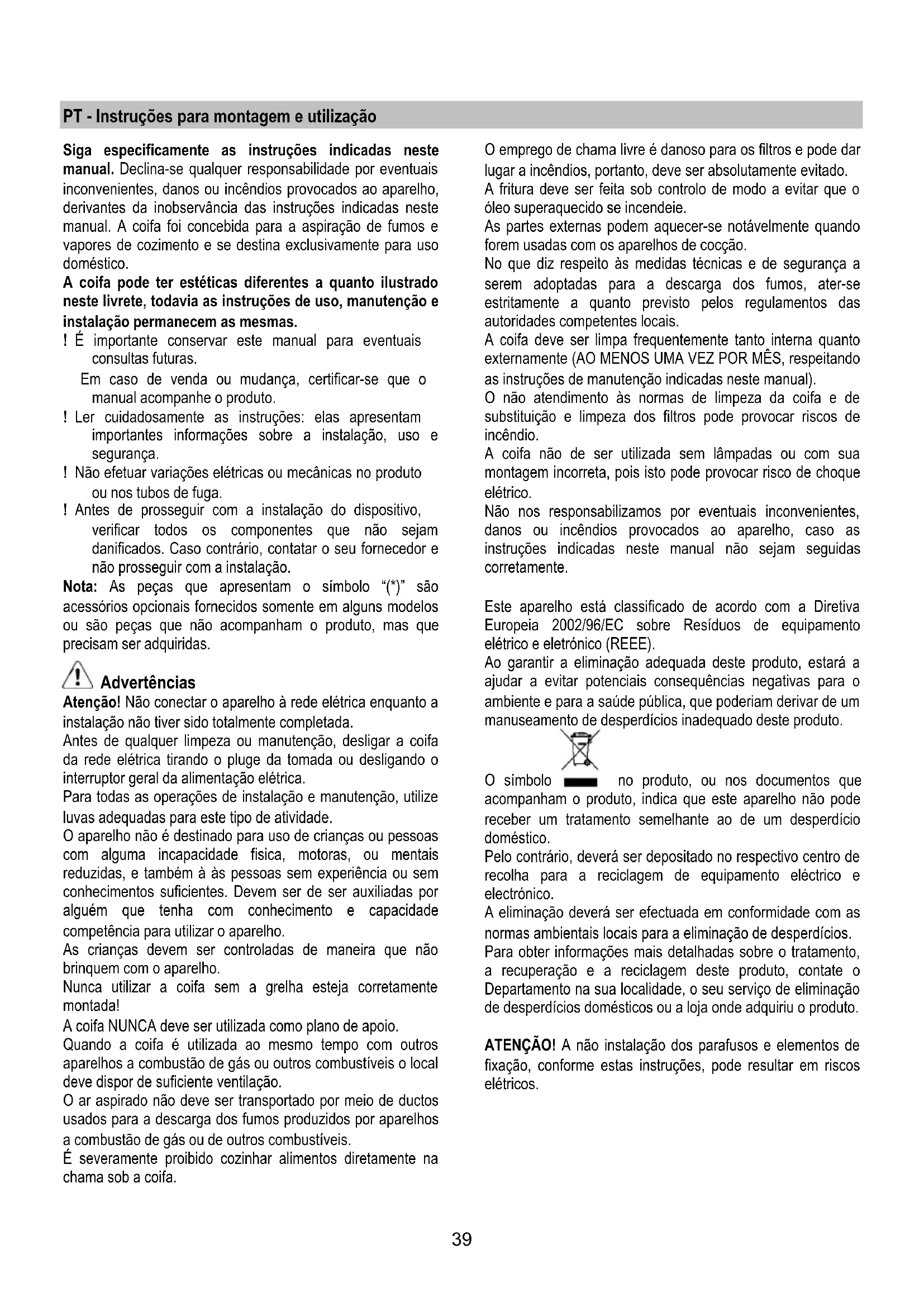 - Filtro a carbones activos NO lavables. Filtro al carbón activo lavable El filtro al carbón puede lavarse cada dos meses con agua caliente y detergentes adecuados o en lavavajillas a 65°C ( en caso de lavado con lavavajillas, realice el ciclo de lavado completo sin platos en el interior.). Quite el agua que haya quedado en el filtro sin estropearlo, después quite el almohadillado situado en el interior del armazón de plástico y póngalo en el horno a 100°C durante diez minutos para secarlo completamente. Cambie el almohadillado cada 3 años y cada vez que el paño se estropee. Filtro al carbón activo NO lavable La saturaciòn del carbòn activado ocurre despuès da mas o menos tiempo de uso prolongado, dependiendo del tipo de cocina y de la regularidad de limpieza del filtro de grasa. En cualquier caso es necesario sustituir el cartucho al menos cada 4 meses. NO puede lavarse o reciclarse. Montaje Enganchar el filtro de carbón activo primero, posteriormente sobre la pestaña metálica de la campana, y después en la parte anterior con las dos perillas. Desmontaje Quitar el filtro de carbón activo girando 90° grados las perillas que lo fijan a la campana. Sustitución de la lámpara La campana viene provista de un sistema de iluminación basado en la tecnología LED. Los LEDS garantizan una óptima iluminación, una duración hasta 10 veces mayor de las lámparas tradicionales y permiten aborra el 90% de energía eléctrica. . Para la sustitución dirigirse al servicio asistencia técnica .39 PT - Instruções para montagem e utilização Siga especificamente as instruções indicadas neste manual. Declina-se qualquer responsabilidade por eventuais inconvenientes, danos ou incêndios provocados ao aparelho, derivantes da inobservância das instruções indicadas neste manual. A coifa foi concebida para a aspiração de fumos e vapores de cozimento e se destina exclusivamente para uso doméstico. A coifa pode ter estéticas diferentes a quanto ilustrado neste livrete, todavia as instruções de uso, manutenção e instalação permanecem as mesmas. ! É importante conservar este manual para eventuais consultas futuras. Em caso de venda ou mudança, certificar-se que o manual acompanhe o produto. ! Ler cuidadosamente as instruções: elas apresentam importantes informações sobre a instalação, uso e segurança. ! Não efetuar variações elétricas ou mecânicas no produto ou nos tubos de fuga. ! Antes de prosseguir com a instalação do dispositivo, verificar todos os componentes que não sejam danificados. Caso contrário, contatar o seu fornecedor e não prosseguir com a instalação. Nota: As peças que apresentam o símbolo “(*)” são acessórios opcionais fornecidos somente em alguns modelos ou são peças que não acompanham o produto, mas que precisam ser adquiridas. Advertências Atenção! Não conectar o aparelho à rede elétrica enquanto a instalação não tiver sido totalmente completada. Antes de qualquer limpeza ou manutenção, desligar a coifa da rede elétrica tirando o pluge da tomada ou desligando o interruptor geral da alimentação elétrica. Para todas as operações de instalação e manutenção, utilize luvas adequadas para este tipo de atividade. O aparelho não é destinado para uso de crianças ou pessoas com alguma incapacidade fisica, motoras, ou mentais reduzidas, e também à às pessoas sem experiência ou sem conhecimentos suficientes. Devem ser de ser auxiliadas por alguém que tenha com conhecimento e capacidade competência para utilizar o aparelho. As crianças devem ser controladas de maneira que não brinquem com o aparelho. Nunca utilizar a coifa sem a grelha esteja corretamente montada! A coifa NUNCA deve ser utilizada como plano de apoio. Quando a coifa é utilizada ao mesmo tempo com outros aparelhos a combustão de gás ou outros combustíveis o local deve dispor de suficiente ventilação. O ar aspirado não deve ser transportado por meio de ductos usados para a descarga dos fumos produzidos por aparelhos a combustão de gás ou de outros combustíveis. É severamente proibido cozinhar alimentos diretamente na chama sob a coifa. O emprego de chama livre é danoso para os filtros e pode dar lugar a incêndios, portanto, deve ser absolutamente evitado. A fritura deve ser feita sob controlo de modo a evitar que o óleo superaquecido se incendeie. As partes externas podem aquecer-se notávelmente quando forem usadas com os aparelhos de cocção. No que diz respeito às medidas técnicas e de segurança a serem adoptadas para a descarga dos fumos, ater-se estritamente a quanto previsto pelos regulamentos das autoridades competentes locais. A coifa deve ser limpa frequentemente tanto interna quanto externamente (AO MENOS UMA VEZ POR MÊS, respeitando as instruções de manutenção indicadas neste manual). O não atendimento às normas de limpeza da coifa e de substituição e limpeza dos filtros pode provocar riscos de incêndio. A coifa não de ser utilizada sem lâmpadas ou com sua montagem incorreta, pois isto pode provocar risco de choque elétrico. Não nos responsabilizamos por eventuais inconvenientes, danos ou incêndios provocados ao aparelho, caso as instruções indicadas neste manual não sejam seguidas corretamente. Este aparelho está classificado de acordo com a Diretiva Europeia 2002/96/EC sobre Resíduos de equipamento elétrico e eletrónico (REEE). Ao garantir a eliminação adequada deste produto, estará a ajudar a evitar potenciais consequências negativas para o ambiente e para a saúde pública, que poderiam derivar de um manuseamento de desperdícios inadequado deste produto. O símbolo no produto, ou nos documentos que acompanham o produto, indica que este aparelho não pode receber um tratamento semelhante ao de um desperdício doméstico. Pelo contrário, deverá ser depositado no respectivo centro de recolha para a reciclagem de equipamento eléctrico e electrónico. A eliminação deverá ser efectu