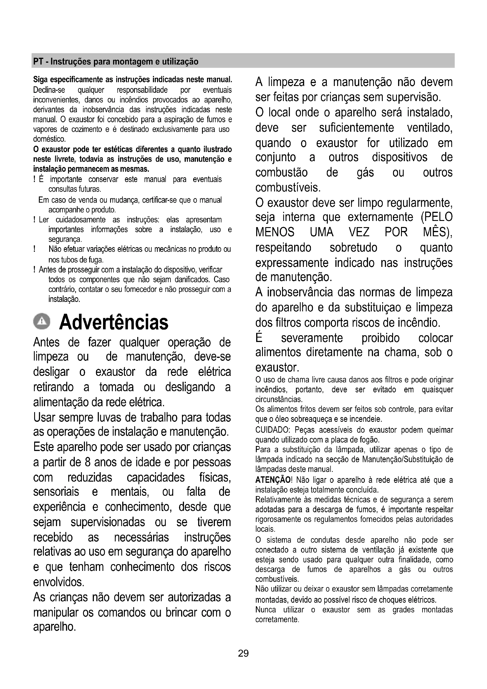 PRODUCTOS QUE CONTENGAN CLORO! Filtro antigrasa Retiene las partículas de grasa producidas cuando se cocina. El filtro antigrasa metálico debe limpiarse una vez al mes con detergentes no agresivos, manualmente o bien en lavavajillas a bajas temperaturas y con ciclo breve. Con el lavado en el lavavajilla el filtro antigrasa metálico puede desteñirse pero sus características de filtrado no cambian absolutamente. Filtro al carbón activo (solamente para la versión filtrante) Retiene los olores desagradables producidos por la cocción de alimentos. La saturaciòn del carbòn activado ocurre despuès da mas o menos tiempo de uso prolongado, dependiendo del tipo de cocina y de la regularidad de limpieza del filtro de grasa. En cualquier caso es necesario sustituir el cartucho al menos cada 4 meses. NO puede lavarse o reciclarse. Sustitución de la lámpara Desconecte el aparato de la red elèctrica. Atención! Antes de tocar las lámparas asegúrese de que esten frías. Sustituir la lámpara dañada con una del mismo tipo como se especifica en la etiqueta correspondiente o en la campana cerca de la lámpara misma . Para sustituir las lámparas en los focos de forma cuadrada, presionar el marco del foco a nivel del símbolo "PUSH", a continuación cambiar la lámpara y cerrar el foco presionando siempre el marco para engancharlo. Utilizar sólo lámparas halógenas de 12V -20W max - G4 (Adecuada para su uso en luminaria abierta) prestando atención en no tocarlas con las manos. Si la iluminación no funciona, antes de llamar al servicio de asistencia técnica, revisar que las lámparas estén correctamente instaladas.29 PT - Instruções para montagem e utilização Siga especificamente as instruções indicadas neste manual. Declina-se qualquer responsabilidade por eventuais inconvenientes, danos ou incêndios provocados ao aparelho, derivantes da inobservância das instruções indicadas neste manual. O exaustor foi concebido para a aspiração de fumos e vapores de cozimento e é destinado exclusivamente para uso doméstico. O exaustor pode ter estéticas diferentes a quanto ilustrado neste livrete, todavia as instruções de uso, manutenção e instalação permanecem as mesmas. ! É importante conservar este manual para eventuais consultas futuras. Em caso de venda ou mudança, certificar-se que o manual acompanhe o produto. ! Ler cuidadosamente as instruções: elas apresentam importantes informações sobre a instalação, uso e segurança. ! Não efetuar variações elétricas ou mecânicas no produto ou nos tubos de fuga. ! Antes de prosseguir com a instalação do dispositivo, verificar todos os componentes que não sejam danificados. Caso contrário, contatar o seu fornecedor e não prosseguir com a instalação. Advertências Antes de fazer qualquer operação de limpeza ou de manutenção, deve-se desligar o exaustor da rede elétrica retirando a tomada ou desligando a alimentação da rede elétrica. Usar sempre luvas de trabalho para todas as operações de instalação e manutenção. Este aparelho pode ser usado por crianças a partir de 8 anos de idade e por pessoas com reduzidas capacidades físicas, sensoriais e mentais, ou falta de experiência e conhecimento, desde que sejam supervisionadas ou se tiverem recebido as necessárias instruções relativas ao uso em segurança do aparelho e que tenham conhecimento dos riscos envolvidos. As crianças não devem ser autorizadas a manipular os comandos ou brincar com o aparelho. A limpeza e a manutenção não devem ser feitas por crianças sem supervisão. O local onde o aparelho será instalado, deve ser suficientemente ventilado, quando o exaustor for utilizado em conjunto a outros dispositivos de combustão de gás ou outros combustíveis. O exaustor deve ser limpo regularmente, seja interna que externamente (PELO MENOS UMA VEZ POR MÊS), respeitando sobretudo o quanto expressamente indicado nas instruções de manutenção. A inobservância das normas de limpeza do aparelho e da substituiçao e limpeza dos filtros comporta riscos de incêndio. É severamente proibido colocar alimentos diretamente na chama, sob o exaustor. O uso de chama livre causa danos aos filtros e pode originar incêndios, portanto, deve ser evitado em quaisquer circunstâncias. Os alimentos fritos devem ser feitos sob controle, para evitar que o óleo sobreaqueça e se incendeie. CUIDADO: Peças acessíveis do exaustor podem queimar quando utilizado com a placa de fogão. Para a substituição da lâmpada, utilizar apenas o tipo de lâmpada indicado na secção de Manutenção/Substituição de lâmpadas deste manual. ATENÇÃO! Não ligar o aparelho à rede elétrica até que a instalação esteja totalmente concluída. Relativamente às medidas técnicas e de segurança a serem adotadas para a descarga de fumos, é importante respeitar rigorosamente os regulamentos fornecidos pelas autoridades locais. O sistema de condutas desde aparelho não pode ser conectado a outro sistema de ventilação já existente que esteja sendo usado para qualquer outra finalidade, como descarga de fumos de aparelhos a gás ou outros combustíveis. Não utilizar ou deixar o exaustor sem lâmpadas corretamente montadas, devido ao possível risco de choques elétricos. Nunca utilizar o exaustor sem as grades montadas corretamente.30 O exaustor NUNCA deve ser utilizado como uma superfície de apoio, a menos que não seja especificamente indicado. Usar somente os parafusos de fixação fornecidos com o aparelho, para a instalação, ou, se não for fornecido, comprar o tipo de parafuso correto. Usar o comprimento correto para os parafusos que são identificados no Guia de Instalação. Em caso de dúvida, consultar um centro de assistência autorizado ou pessoa qualificada similar. ATENÇÃO! A falta de instalação de parafusos ou dispositivos de fixação em conformidade com estas instruções, pode resultar em riscos elétricos. Este aparelho está classificado de acor