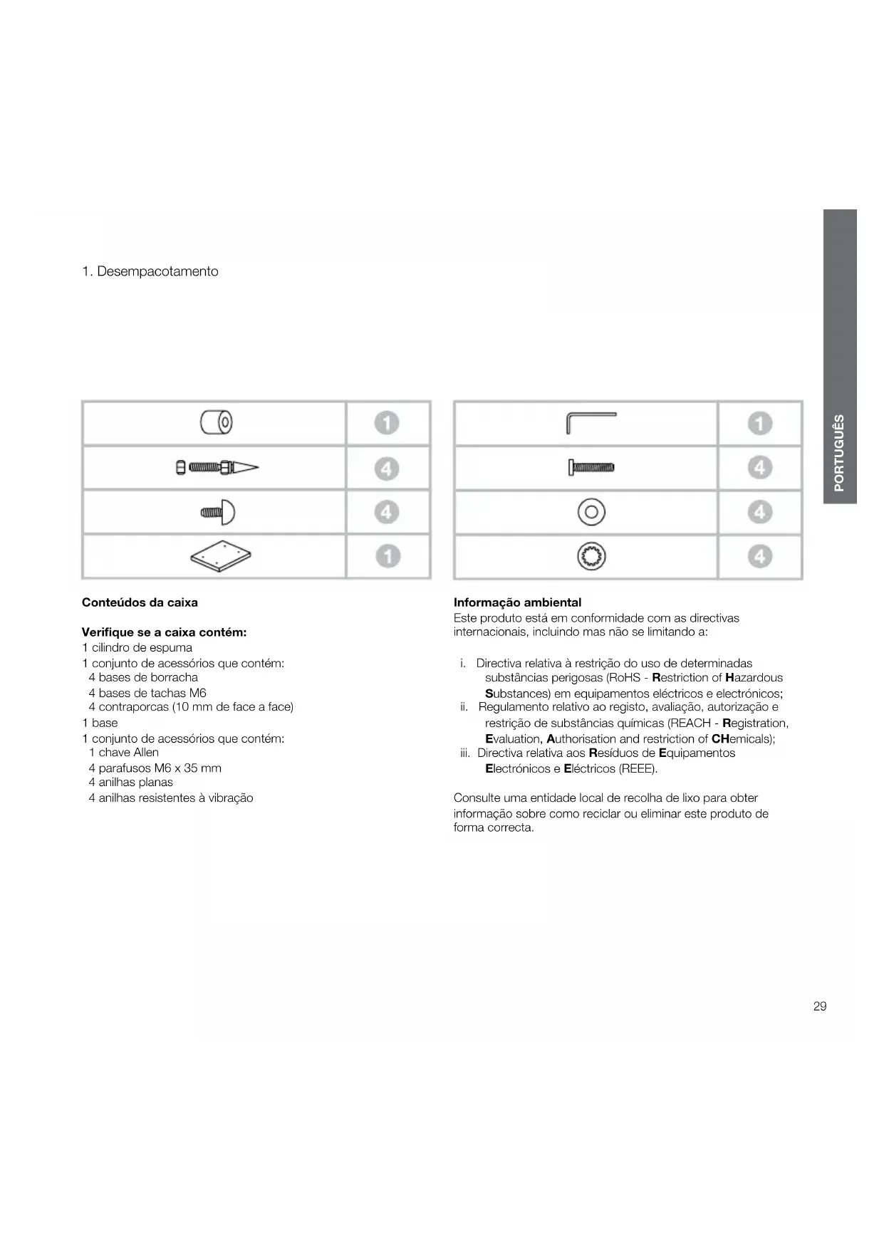 Conteúdos da caixa Verique se a caixa contém: 1 cilindro de espuma 1 conjunto de acessórios que contém: 4 bases de borracha 4 bases de tachas M6 4 contraporcas (10 mm de face a face) 1 base 1 conjunto de acessórios que contém: 1 chave Allen 4 parafusos M6 x 35 mm 4 anilhas planas 4 anilhas resistentes à vibração Informação ambiental Este produto está em conformidade com as directivas internacionais, incluindo mas não se limitando a: