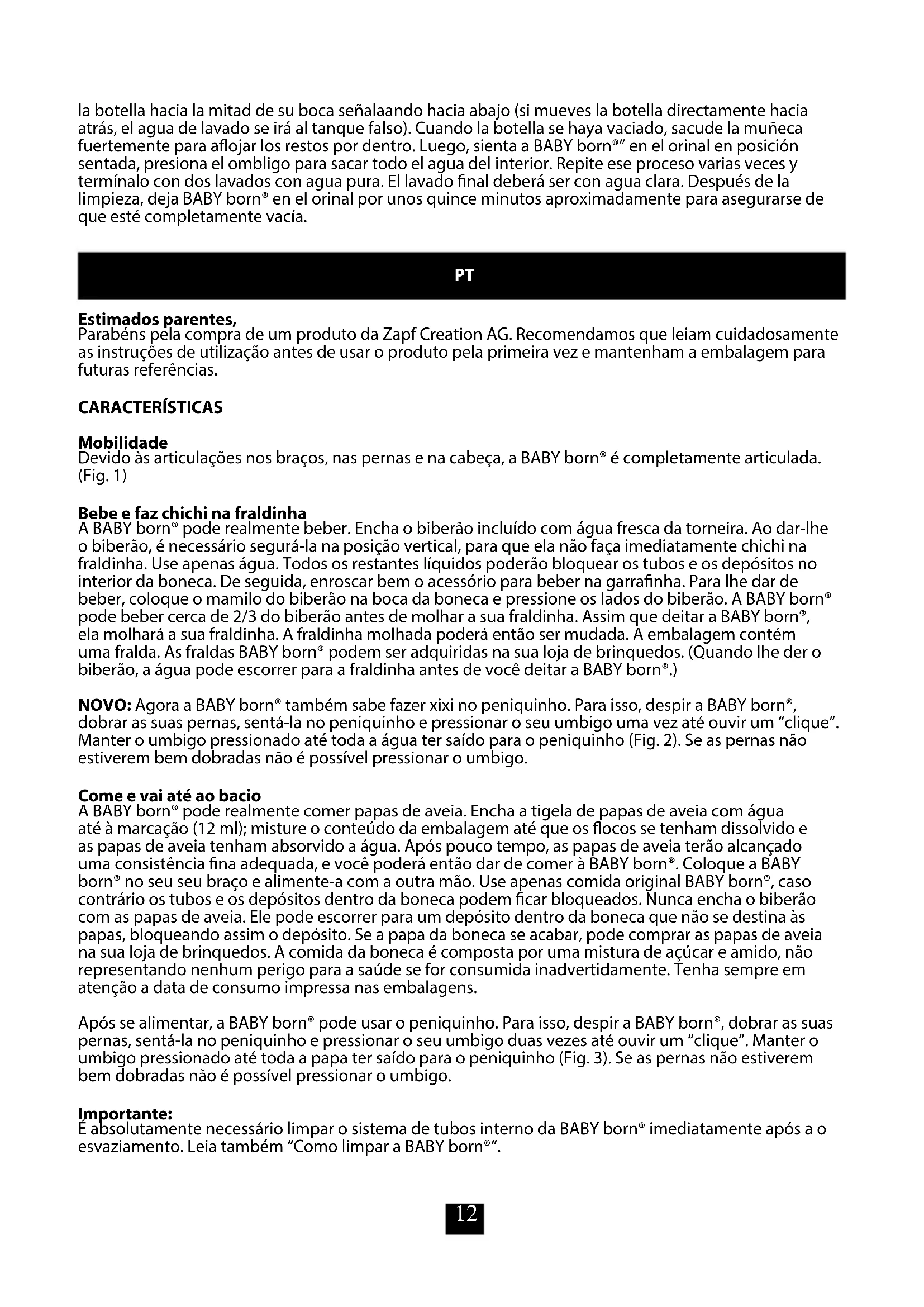 Estimados parentes, Parabéns pela compra de um produto da Zapf Creation AG. Recomendamos que leiam cuidadosamente as instruções de utilização antes de usar o produto pela primeira vez e mantenham a embalagem para futuras referências. CARACTERÍSTICAS Mobilidade Devido às articulações nos braços, nas pernas e na cabeça, a BABY born® é completamente articulada. (Fig. 1) Bebe e faz chichi na fraldinha A BABY born® pode realmente beber. Encha o biberão incluído com água fresca da torneira. Ao dar-lhe o biberão, é necessário segurá-la na posição vertical, para que ela não faça imediatamente chichi na fraldinha. Use apenas água. Todos os restantes líquidos poderão bloquear os tubos e os depósitos no interior da boneca. De seguida, enroscar bem o acessório para beber na garranha. Para lhe dar de beber, coloque o mamilo do biberão na boca da boneca e pressione os lados do biberão. A BABY born® pode beber cerca de 2/3 do biberão antes de molhar a sua fraldinha. Assim que deitar a BABY born®, ela molhará a sua fraldinha. A fraldinha molhada poderá então ser mudada. A embalagem contém uma fralda. As fraldas BABY born® podem ser adquiridas na sua loja de brinquedos. (Quando lhe der o biberão, a água pode escorrer para a fraldinha antes de você deitar a BABY born®.) NOVO: Agora a BABY born® também sabe fazer xixi no peniquinho. Para isso, despir a BABY born®, dobrar as suas pernas, sentá-la no peniquinho e pressionar o seu umbigo uma vez até ouvir um “clique”. Manter o umbigo pressionado até toda a água ter saído para o peniquinho (Fig. 2). Se as pernas não estiverem bem dobradas não é possível pressionar o umbigo. Come e vai até ao bacio A BABY born® pode realmente comer papas de aveia. Encha a tigela de papas de aveia com água até à marcação (12 ml); misture o conteúdo da embalagem até que os ocos se tenham dissolvido e as papas de aveia tenham absorvido a água. Após pouco tempo, as papas de aveia terão alcançado uma consistência na adequada, e você poderá então dar de comer à BABY born®. Coloque a BABY born® no seu seu braço e alimente-a com a outra mão. Use apenas comida original BABY born®, caso contrário os tubos e os depósitos dentro da boneca podem car bloqueados. Nunca encha o biberão com as papas de aveia. Ele pode escorrer para um depósito dentro da boneca que não se destina às papas, bloqueando assim o depósito. Se a papa da boneca se acabar, pode comprar as papas de aveia na sua loja de brinquedos. A comida da boneca é composta por uma mistura de açúcar e amido, não representando nenhum perigo para a saúde se for consumida inadvertidamente. Tenha sempre em atenção a data de consumo impressa nas embalagens. Após se alimentar, a BABY born® pode usar o peniquinho. Para isso, despir a BABY born®, dobrar as suas pernas, sentá-la no peniquinho e pressionar o seu umbigo duas vezes até ouvir um “clique”. Manter o umbigo pressionado até toda a papa ter saído para o peniquinho (Fig. 3). Se as pernas não estiverem bem dobradas não é possível pressionar o umbigo. Importante: É absolutamente necessário limpar o sistema de tubos interno da BABY born® imediatamente após a o esvaziamento. Leia também “Como limpar a BABY born®“.13 Choro Se apertar o braço direito da BABY born® vária vezes, ela chora lágrimas de verdade. (Primeiro a BABY born® deve beber água e não pode fazer xixi na fralda nem usar o peniquinho. ) Banho A BABY born® pode tomar um banho na banheira ou ser levada até à piscina. No entanto, ela não pode ser imersa na água. Não deixe a Baby born abandonada directamente sob a ação dos raios solares por um período de tempo muito prolongado (máx. 1 hora). Antes de lhe dar banho certique-se de que a capa do parafuso na parte de trás da BABY born® está fechada (a tampa de rosca para a vertical posição). Para o banho, deverá usar apenas água fria ou tépida, e apenas aditivos de banho adequados para criança. A BABY born® não deve ser deixada na banheira, em água com cloro ou água salgada durante mais de 3 horas, caso contrário poderão ocorrer reações químicas e perda de cor. Depois do banho, limpe a sua BABY born® com água da torneira. Se durante o banho penetrar água dentro da sua boneca, pode secar a BABY born® da seguinte forma: use uma chave de fendas ou uma moeda para desenroscar cuidadosamente a tampa de rosca (no sentido contrário ao dos ponteiros do relógio) na parte de trás da BABY born®, e em seguida puxe-a um pouco para fora. Ela não pode ser removida completamente! A água pode ser removida, agitando cuidadosamente a boneca para a frente e para trás (com as costas voltadas para baixo). Repita várias vezes esta ação. Se necessário, ventile a boneca com a tampa de rosca aberta durante 2 a 3 horas, para eliminar a humidade residual. Após a secagem, feche a tampa de rosca no sentido dos ponteiros do relógio. Importante:
