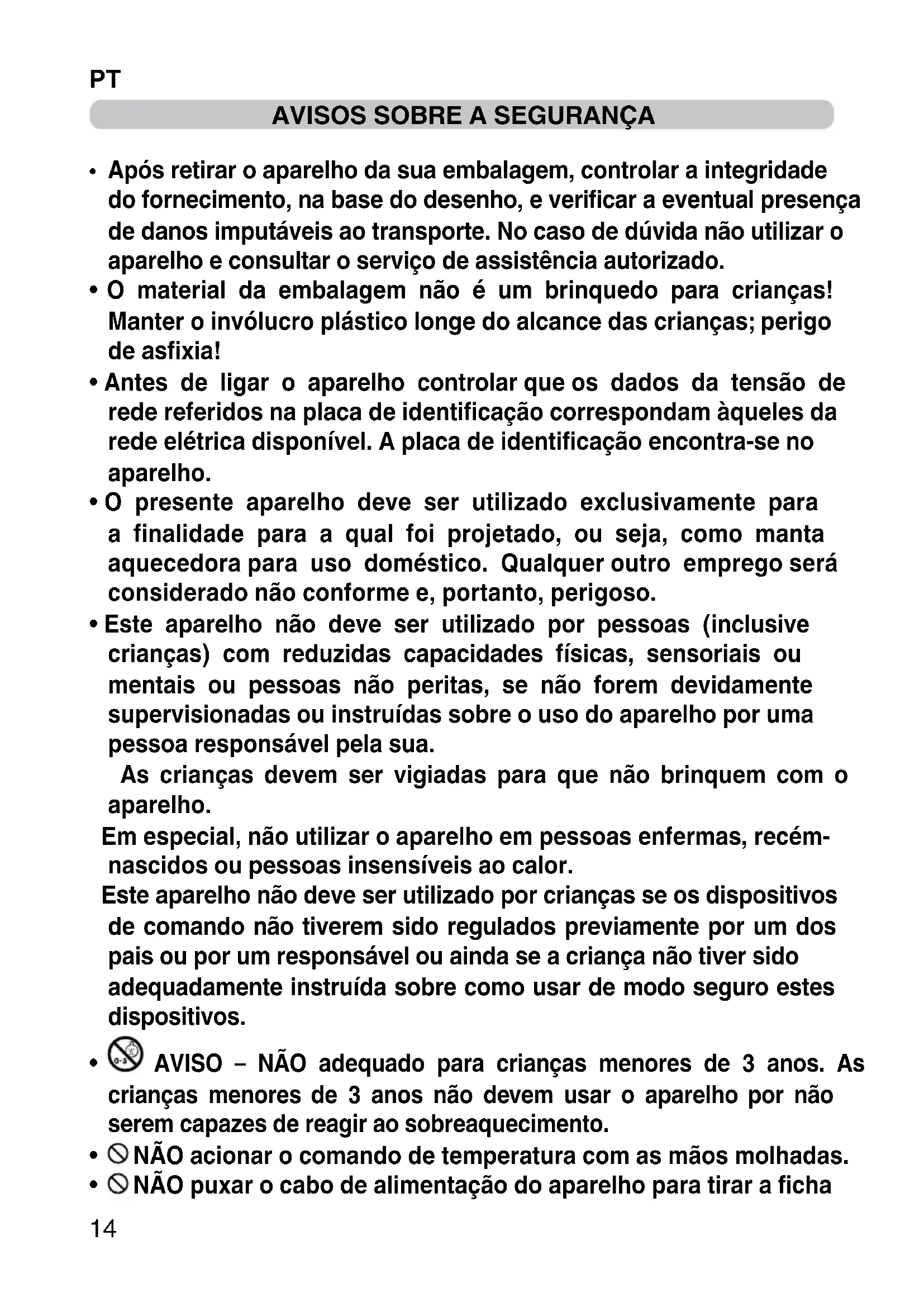- Este aparelho não deve ser utilizado por pessoas (inclusive crianças) com reduzidas capacidades físicas, sensoriais ou mentais ou pessoas não peritas, se não forem devidamente supervisionadas ou instruídas sobre o uso do aparelho por uma pessoa responsável pela sua. As crianças devem ser vigiadas para que não brinquem com o aparelho. Em especial, não utilizar o aparelho em pessoas enfermas, recém- nascidos ou pessoas insensíveis ao calor. Este aparelho não deve ser utilizado por crianças se os dispositivos de comando não tiverem sido regulados previamente por um dos pais ou por um responsável ou ainda se a criança não tiver sido adequadamente instruída sobre como usar de modo seguro estes dispositivos.
