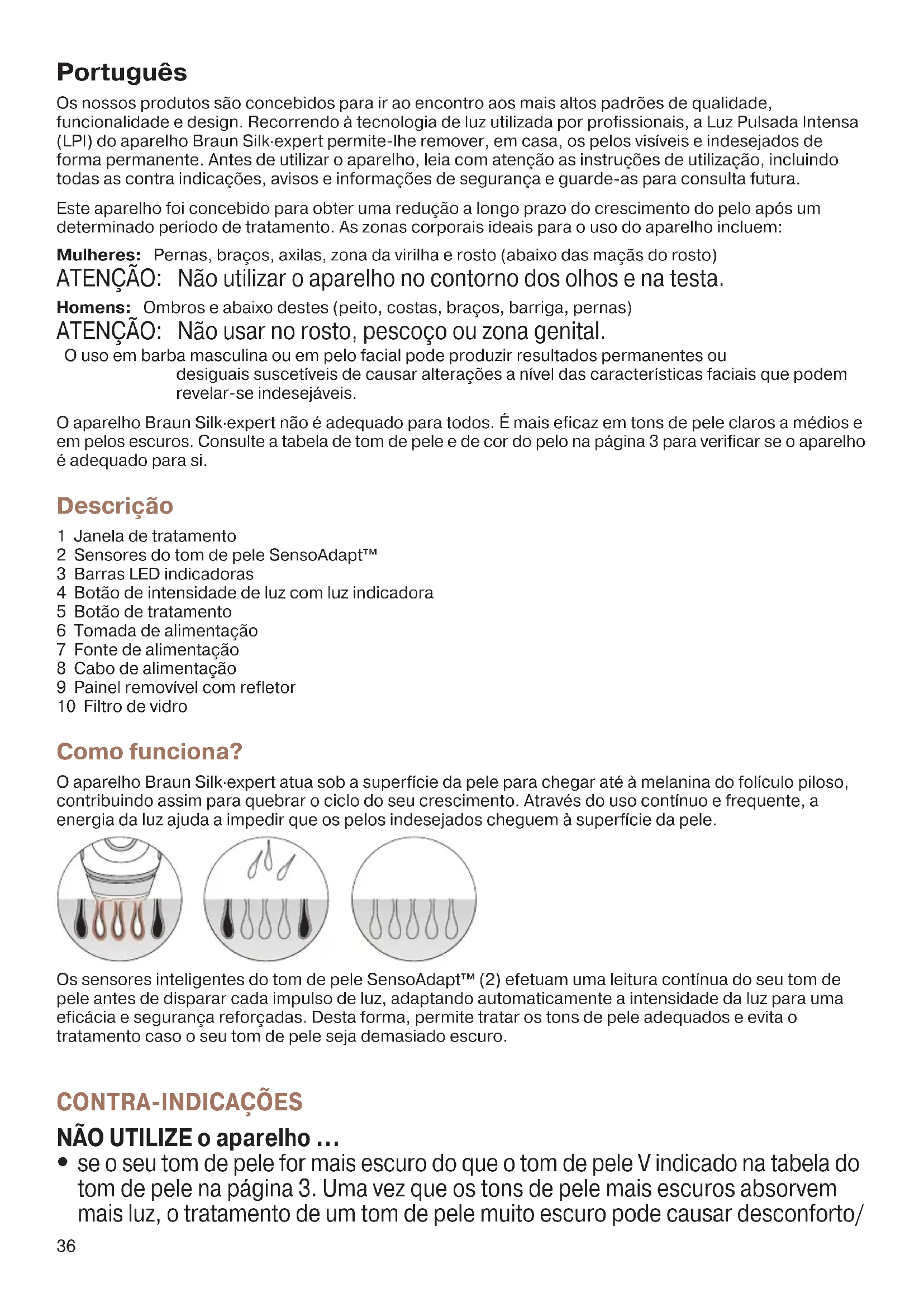 em pelos faciais/na barba no caso dos homens. NÃO olhe diretamente para o filtro de vidro (10) nem tente ativar o aparelho voltando-o na direção dos olhos. Para proteger os seus olhos e os das pessoas que estejam junto de si, o aparelho só se ativará quando os sensores do tom de pele estiverem em contacto com a pele. Se o aparelho se ativar quando os sensores NÃO estiverem em contacto com a pele, PARE o tratamento de imediato e contacte o seu revendedor. NÃO UTILIZE mais do que uma vez por semana na mesma área. Isso não acelerará os resultados e pode aumentar as probabilidades de lesão na sua pele. PRECAUÇÕES