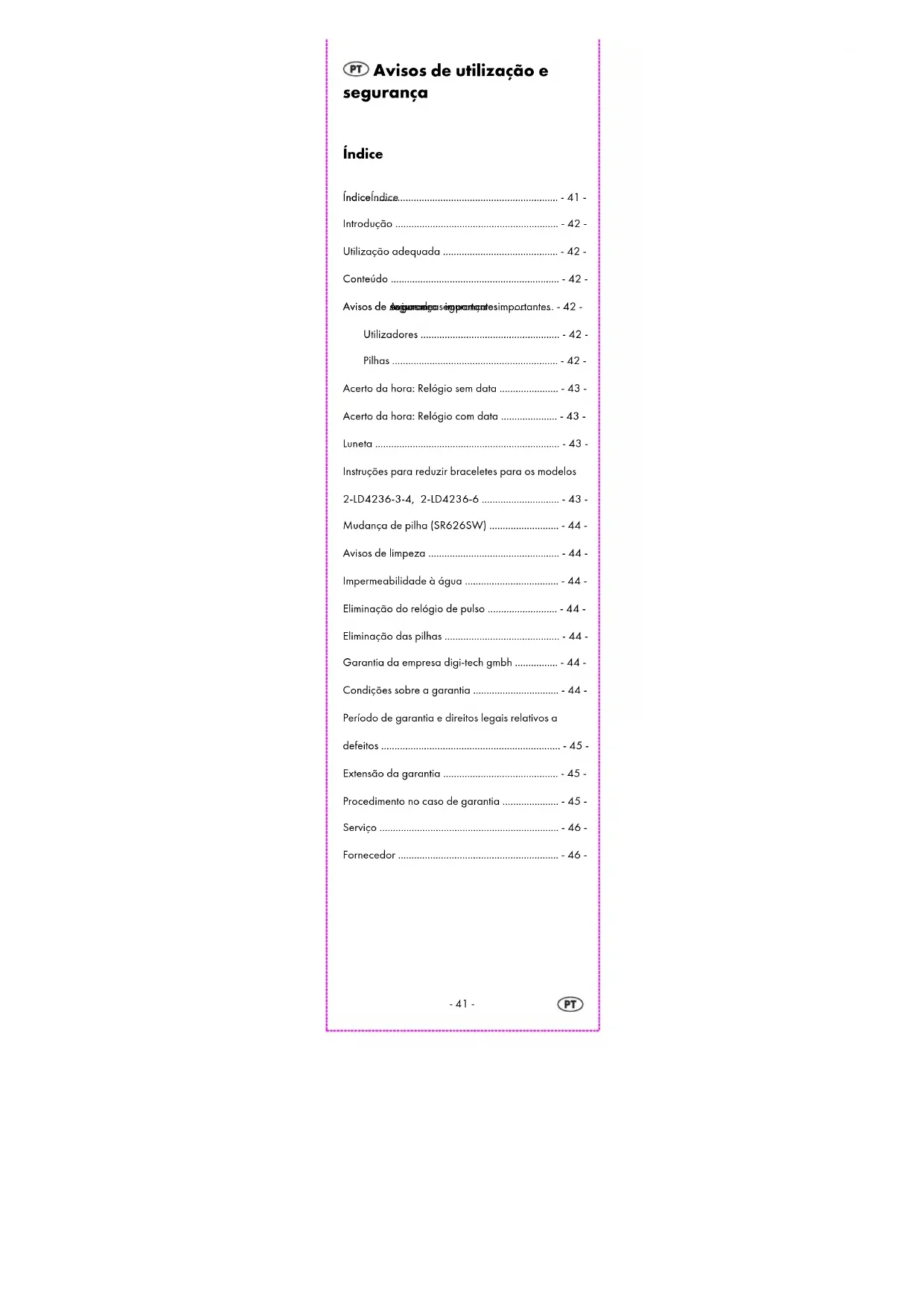Índice ÍndiceÍndice Índice ..................................................................... - 41 - Introdução ............................................................. - 42 - Utilização adequada ........................................... - 42 - Conteúdo ............................................................... - 42 - Avisos de Avisos de Avisos de Avisos de segurança segurançasegurança segurança importantes importantesimportantes importantes .................... - 42 - Utilizadores .................................................... - 42 - Pilhas .............................................................. - 42 - Acerto da hora: Relógio sem data ...................... - 43 - Acerto da hora: Relógio com data ..................... - 43 - Luneta ..................................................................... - 43 - Instruções para reduzir braceletes para os modelos 2-LD4236-3-4, 2-LD4236-6 ............................. - 43 - Mudança de pilha (SR626SW) .......................... - 44 - Avisos de limpeza ................................................. - 44 - Impermeabilidade à água ................................... - 44 - Eliminação do relógio de pulso .......................... - 44 - Eliminação das pilhas ........................................... - 44 - Garantia da empresa digi-tech gmbh ................ - 44 - Condições sobre a garantia ................................ - 44 - Período de garantia e direitos legais relativos a defeitos ................................................................... - 45 - Extensão da garantia ........................................... - 45 - Procedimento no caso de garantia ..................... - 45 - Serviço ................................................................... - 46 - Fornecedor ............................................................ - 46 --