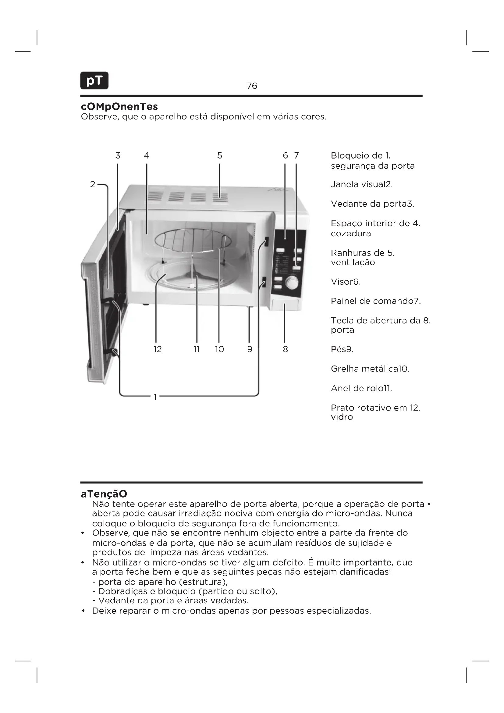 Bloqueio de 1. segurança da porta Janela visual2. Vedante da porta3. Espaço interior de 4. cozedura Ranhuras de 5. ventilação Visor6. Painel de comando7. Tecla de abertura da 8. porta Pés9. Grelha metálica10. Anel de rolo11. Prato rotativo em 12. vidro aTençãO cOMpOnenTes