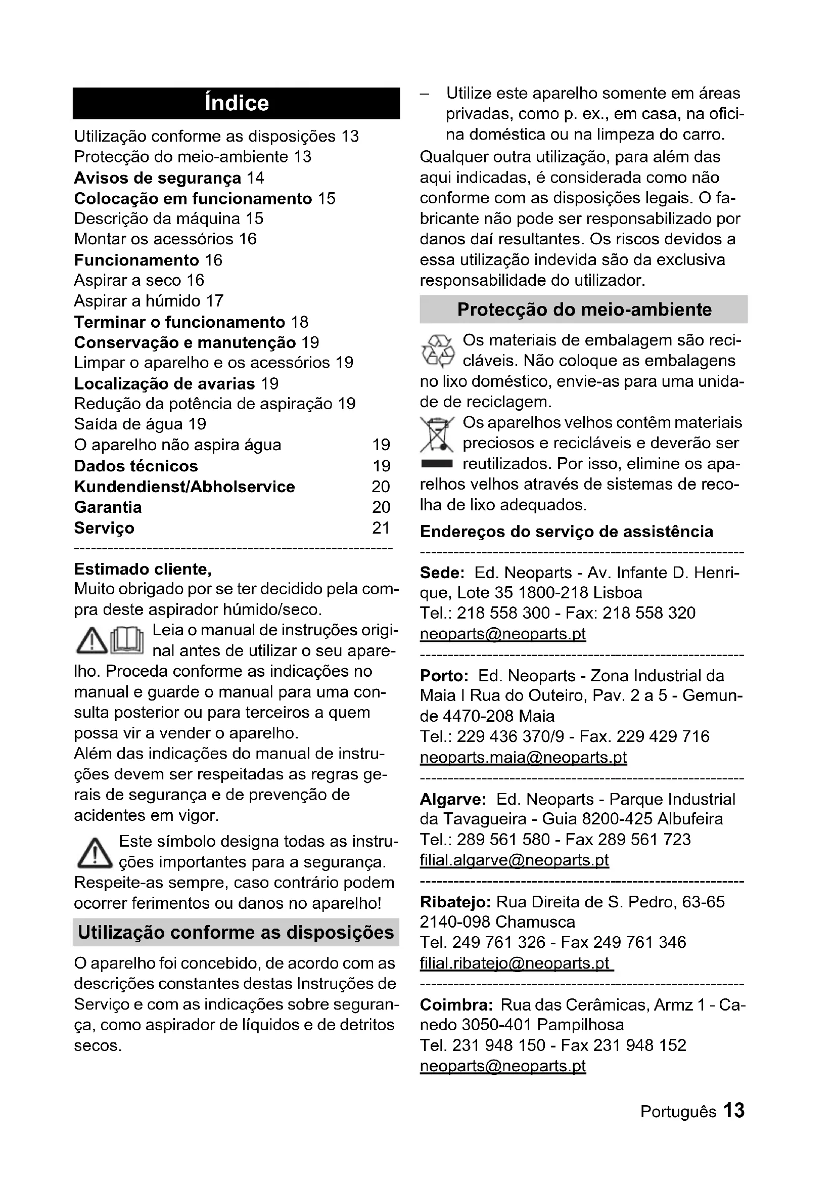 Estimado cliente, Muito obrigado por se ter decidido pela com- pra deste aspirador húmido/seco. Leia o manual de instruções origi- nal antes de utilizar o seu apare- lho. Proceda conforme as indicações no manual e guarde o manual para uma con- sulta posterior ou para terceiros a quem possa vir a vender o aparelho. Além das indicações do manual de instru- ções devem ser respeitadas as regras ge- rais de segurança e de prevenção de acidentes em vigor. Este símbolo designa todas as instru- ções importantes para a segurança. Respeite-as sempre, caso contrário podem ocorrer ferimentos ou danos no aparelho! O aparelho foi concebido, de acordo com as descrições constantes destas Instruções de Serviço e com as indicações sobre seguran- ça, como aspirador de líquidos e de detritos secos. – Utilize este aparelho somente em áreas privadas, como p. ex., em casa, na ofici- na doméstica ou na limpeza do carro. Qualquer outra utilização, para além das aqui indicadas, é considerada como não conforme com as disposições legais. O fa- bricante não pode ser responsabilizado por danos daí resultantes. Os riscos devidos a essa utilização indevida são da exclusiva responsabilidade do utilizador. Os materiais de embalagem são reci- cláveis. Não coloque as embalagens no lixo doméstico, envie-as para uma unida- de de reciclagem. Os aparelhos velhos contêm materiais preciosos e recicláveis e deverão ser reutilizados. Por isso, elimine os apa- relhos velhos através de sistemas de reco- lha de lixo adequados. Endereços do serviço de assistência