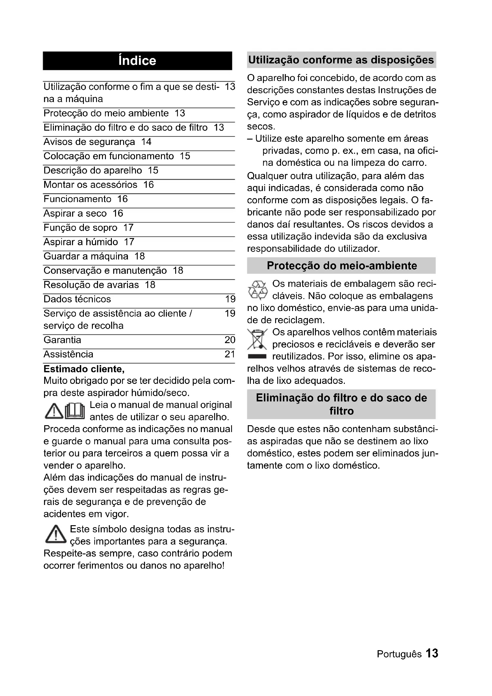 Protecção do meio ambiente 13 Eliminação do filtro e do saco de filtro 13 Avisos de segurança 14 Colocação em funcionamento 15 Descrição do aparelho 15 Montar os acessórios 16 Funcionamento 16 Aspirar a seco 16 Função de sopro 17 Aspirar a húmido 17 Guardar a máquina 18 Conservação e manutenção 18 Resolução de avarias 18 Dados técnicos 19 Serviço de assistência ao cliente / serviço de recolha