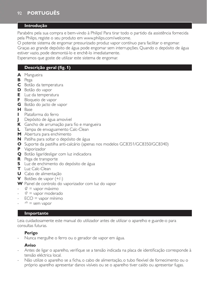 GC-8350 - Ferro de passar PHILIPS - Manual de utilização gratuito
