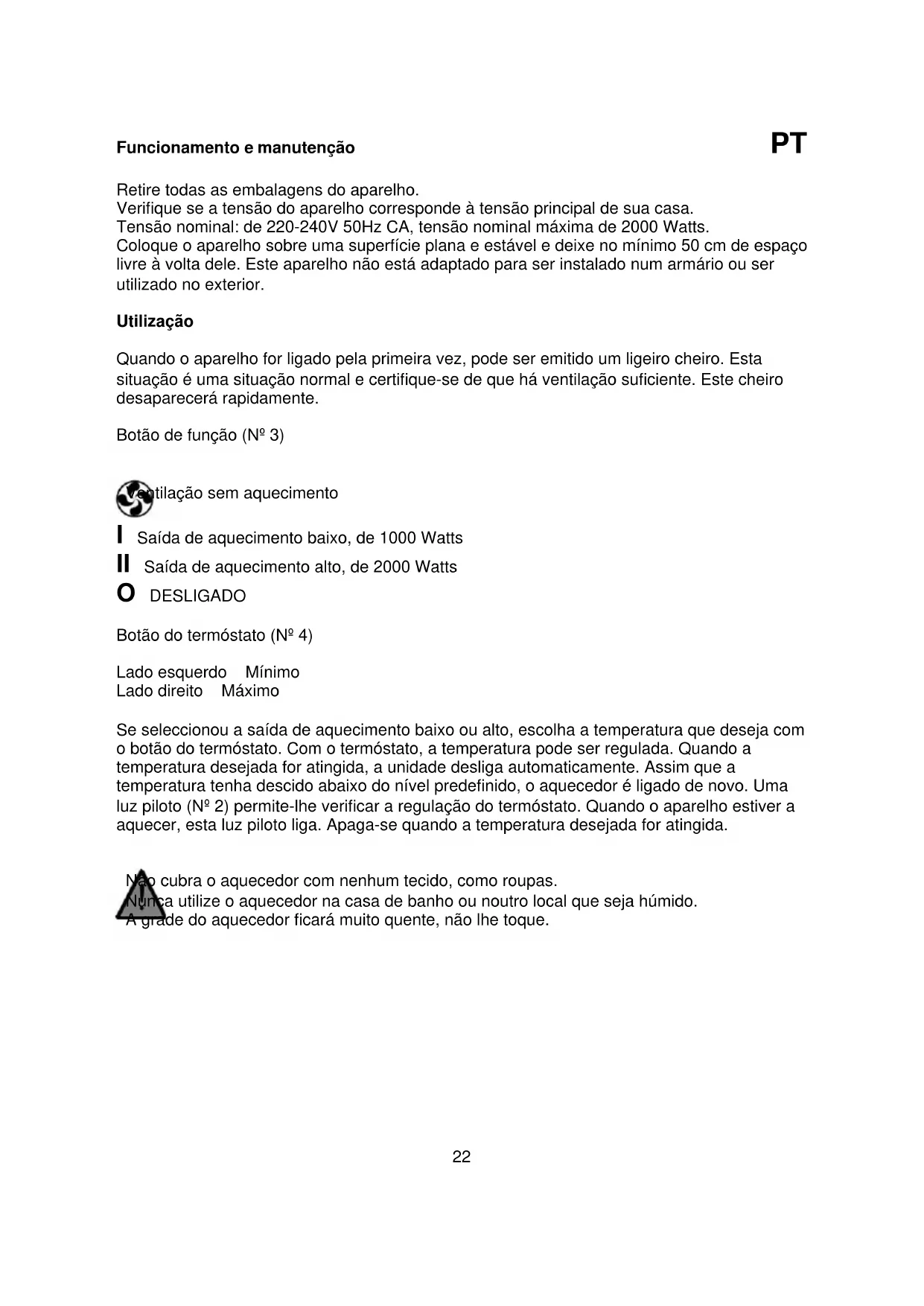 Não cubra o aquecedor com nenhum tecido, como roupas. Nunca utilize o aquecedor na casa de banho ou noutro local que seja húmido. A grade do aquecedor ficará muito quente, não lhe toque.23