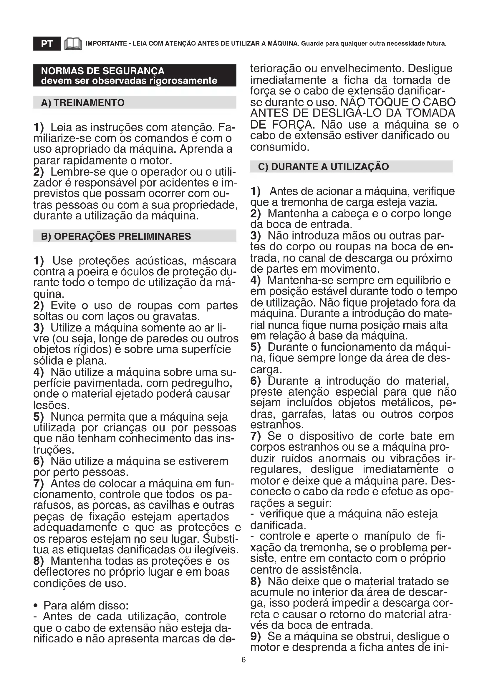 - Para além disso: - Não utilize a máquina se o interrup- tor estiver defeituoso e não conseguir ligar e desligar normalmente a máquina. - Não toque o cabo de extensão e a cha com as mãos molhadas. - Não pise e não dê puxões no cabo de extensão. - Pare a máquina e desligue o cabo de alimentação: - todas as vezes que se deixa a má- quina sem vigilância; - antes de eliminar as causas de bloqueio ou desobstruir o canal de descarga. ATENÇÃO - No caso de quebras ou acidentes durante o trabalho, pare ime- diatamente o motor ; no caso de aciden- tes com lesões pessoais ou a terceiros, ative imediatamente os procedimentos de pronto-socorro mais adequados à situação existente e procure um Atendi- mento Médico para os tratamentos ne- cessários.