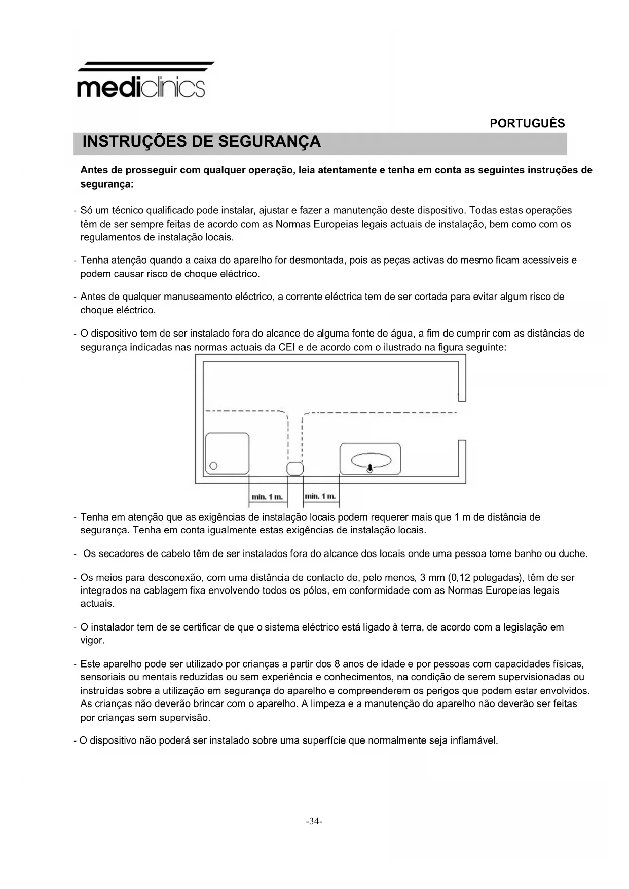 - Tenha em atenção que as exigências de instalação locais podem requerer mais que 1 m de distância de segurança. Tenha em conta igualmente estas exigências de instalação locais. - Os secadores de cabelo têm de ser instalados fora do alcance dos locais onde uma pessoa tome banho ou duche. - Os meios para desconexão, com uma distância de contacto de, pelo menos, 3 mm (0,12 polegadas), têm de ser integrados na cablagem fixa envolvendo todos os pólos, em conformidade com as Normas Europeias legais actuais. - O instalador tem de se certificar de que o sistema eléctrico está ligado à terra, de acordo com a legislação em vigor. - Este aparelho pode ser utilizado por crianças a partir dos 8 anos de idade e por pessoas com capacidades físicas, sensoriais ou mentais reduzidas ou sem experiência e conhecimentos, na condição de serem supervisionadas ou instruídas sobre a utilização em segurança do aparelho e compreenderem os perigos que podem estar envolvidos. As crianças não deverão brincar com o aparelho. A limpeza e a manutenção do aparelho não deverão ser feitas por crianças sem supervisão. - O dispositivo não poderá ser instalado sobre uma superfície que normalmente seja inflamável.