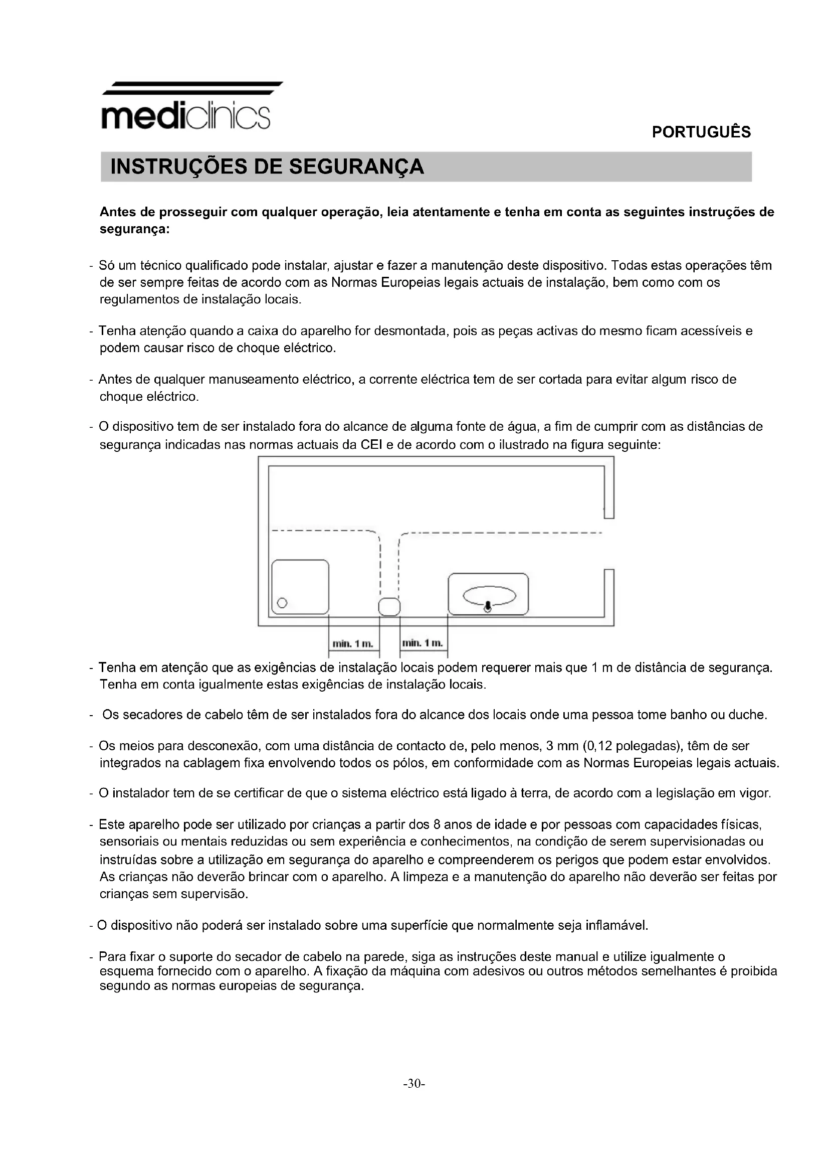 - Tenha em atenção que as exigências de instalação locais podem requerer mais que 1 m de distância de segurança. Tenha em conta igualmente estas exigências de instalação locais. - Os secadores de cabelo têm de ser instalados fora do alcance dos locais onde uma pessoa tome banho ou duche. - Os meios para desconexão, com uma distância de contacto de, pelo menos, 3 mm (0,12 polegadas), têm de ser integrados na cablagem fixa envolvendo todos os pólos, em conformidade com as Normas Europeias legais actuais. - O instalador tem de se certificar de que o sistema eléctrico está ligado à terra, de acordo com a legislação em vigor. - Este aparelho pode ser utilizado por crianças a partir dos 8 anos de idade e por pessoas com capacidades físicas, sensoriais ou mentais reduzidas ou sem experiência e conhecimentos, na condição de serem supervisionadas ou instruídas sobre a utilização em segurança do aparelho e compreenderem os perigos que podem estar envolvidos. As crianças não deverão brincar com o aparelho. A limpeza e a manutenção do aparelho não deverão ser feitas por crianças sem supervisão. - O dispositivo não poderá ser instalado sobre uma superfície que normalmente seja inflamável. - Para fixar o suporte do secador de cabelo na parede, siga as instruções deste manual e utilize igualmente o esquema fornecido com o aparelho. A fixação da máquina com adesivos ou outros métodos semelhantes é proibida segundo as normas europeias de segurança.