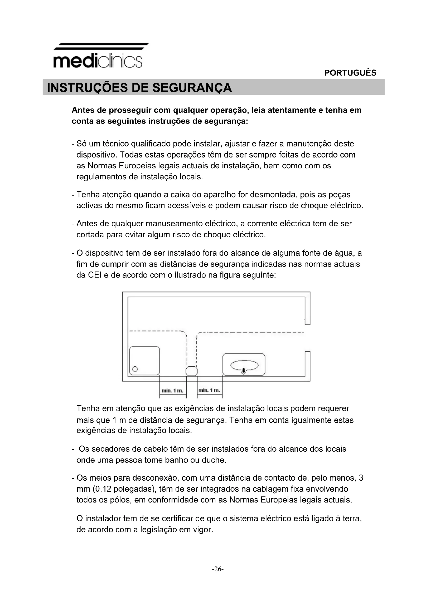 Antes de prosseguir com qualquer operação, leia atentamente e tenha em conta as seguintes instruções de segurança: - Só um técnico qualificado pode instalar, ajustar e fazer a manutenção deste dispositivo. Todas estas operações têm de ser sempre feitas de acordo com as Normas Europeias legais actuais de instalação, bem como com os regulamentos de instalação locais. - Tenha atenção quando a caixa do aparelho for desmontada, pois as peças activas do mesmo ficam acessíveis e podem causar risco de choque eléctrico. - Antes de qualquer manuseamento eléctrico, a corrente eléctrica tem de ser cortada para evitar algum risco de choque eléctrico. - O dispositivo tem de ser instalado fora do alcance de alguma fonte de água, a fim de cumprir com as distâncias de segurança indicadas nas normas actuais da CEI e de acordo com o ilustrado na figura seguinte: - Tenha em atenção que as exigências de instalação locais podem requerer mais que 1 m de distância de segurança. Tenha em conta igualmente estas exigências de instalação locais. - Os secadores de cabelo têm de ser instalados fora do alcance dos locais onde uma pessoa tome banho ou duche. - Os meios para desconexão, com uma distância de contacto de, pelo menos, 3 mm (0,12 polegadas), têm de ser integrados na cablagem fixa envolvendo todos os pólos, em conformidade com as Normas Europeias legais actuais. - O instalador tem de se certificar de que o sistema eléctrico está ligado à terra, de acordo com a legislação em vigor.